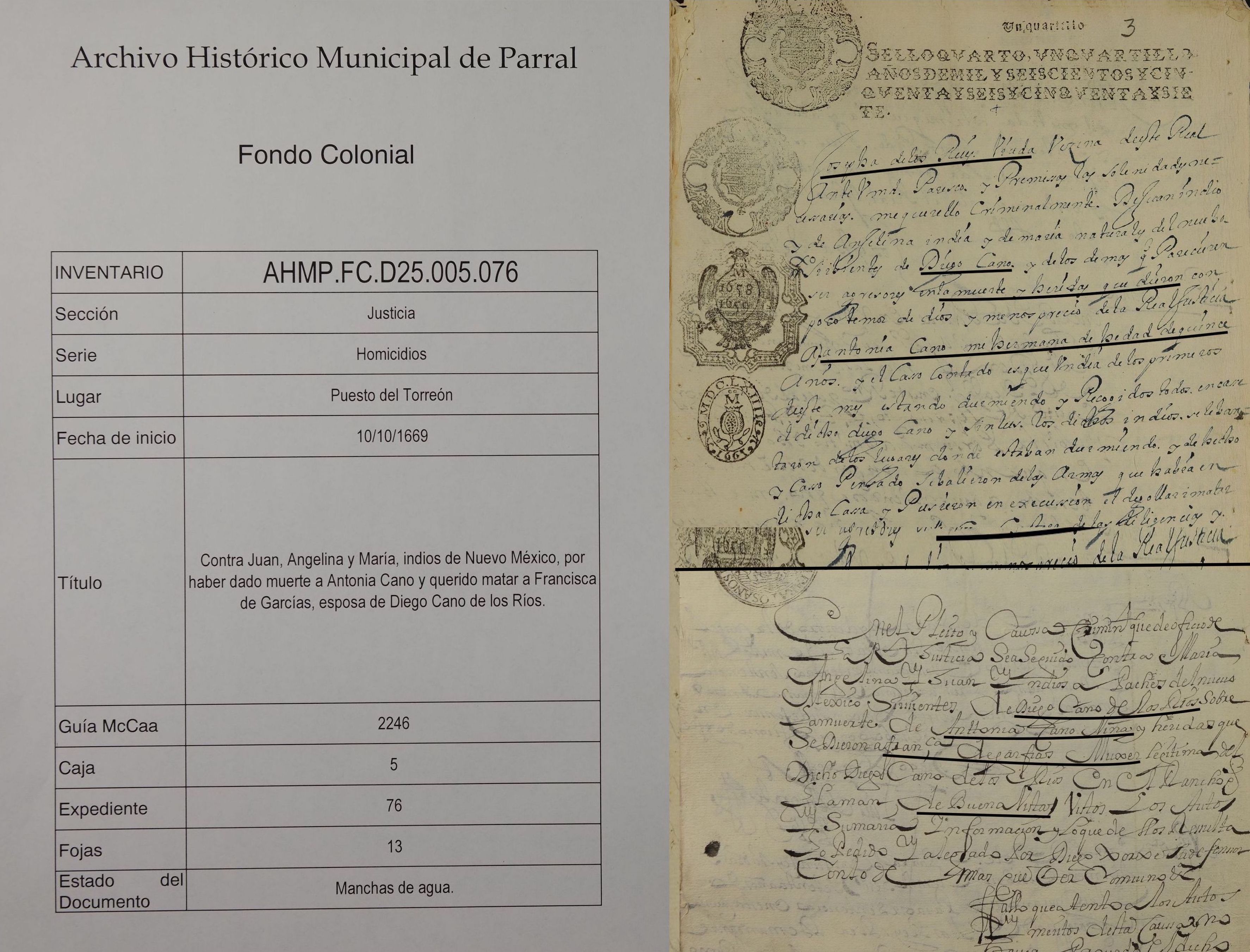 | Event | Diego's wife Francisca Garfias was injured in an attack by apache servants. 2246 880 Contra Maria y Angelina y Juan yndios apaches de Nuevo Mexico sirvientes de Diego Cano de los Rios sobre la muerte de Antonia Niña y heridas que se dieron a Franca de Garfias muxer legitima de dho Diego Cano de los Rios [Cáratula de Di Pesso: Contra unos indios apaches por homicidio perpetrado en la persona de Antonio, indio]. 7 ff. G-44 Año 1669 A young girl Antonia Cano, age 15, was killed when 3 servants attacked the family on the Rancho BuenaVista. According to a deposition given by the widow Josepha de los Reís, Antonia was her sister. It's not clear what relationship Josefa and Antonia had to the Diego Cano de los Rios family. Magdalena de Garfias testified that Francisca was her daughter. |