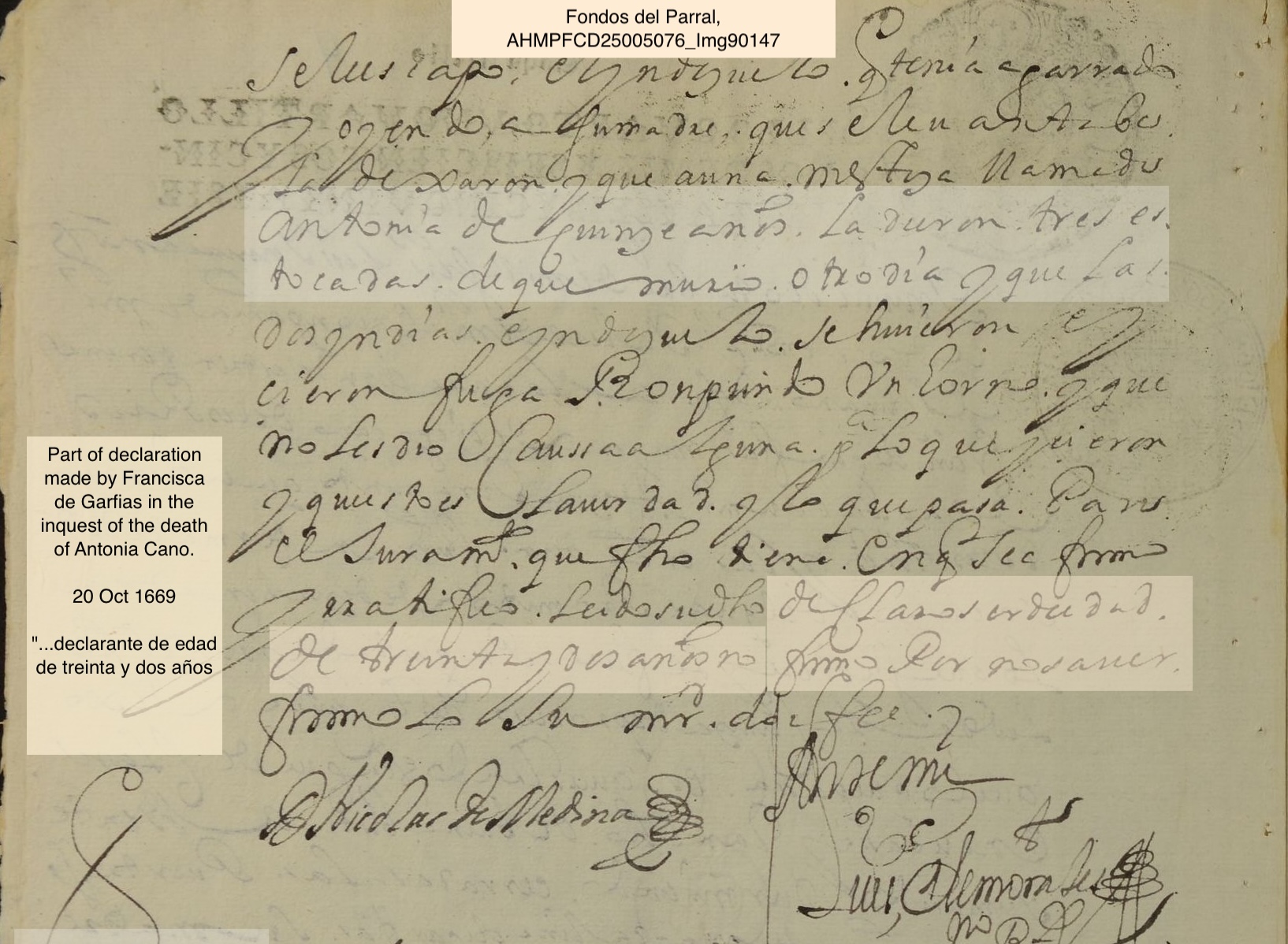 | Birth | In a declaration at the Inquest of the death of Antonia Cano in 1669 Francisca stated she (Francisca) was 32 years old. |