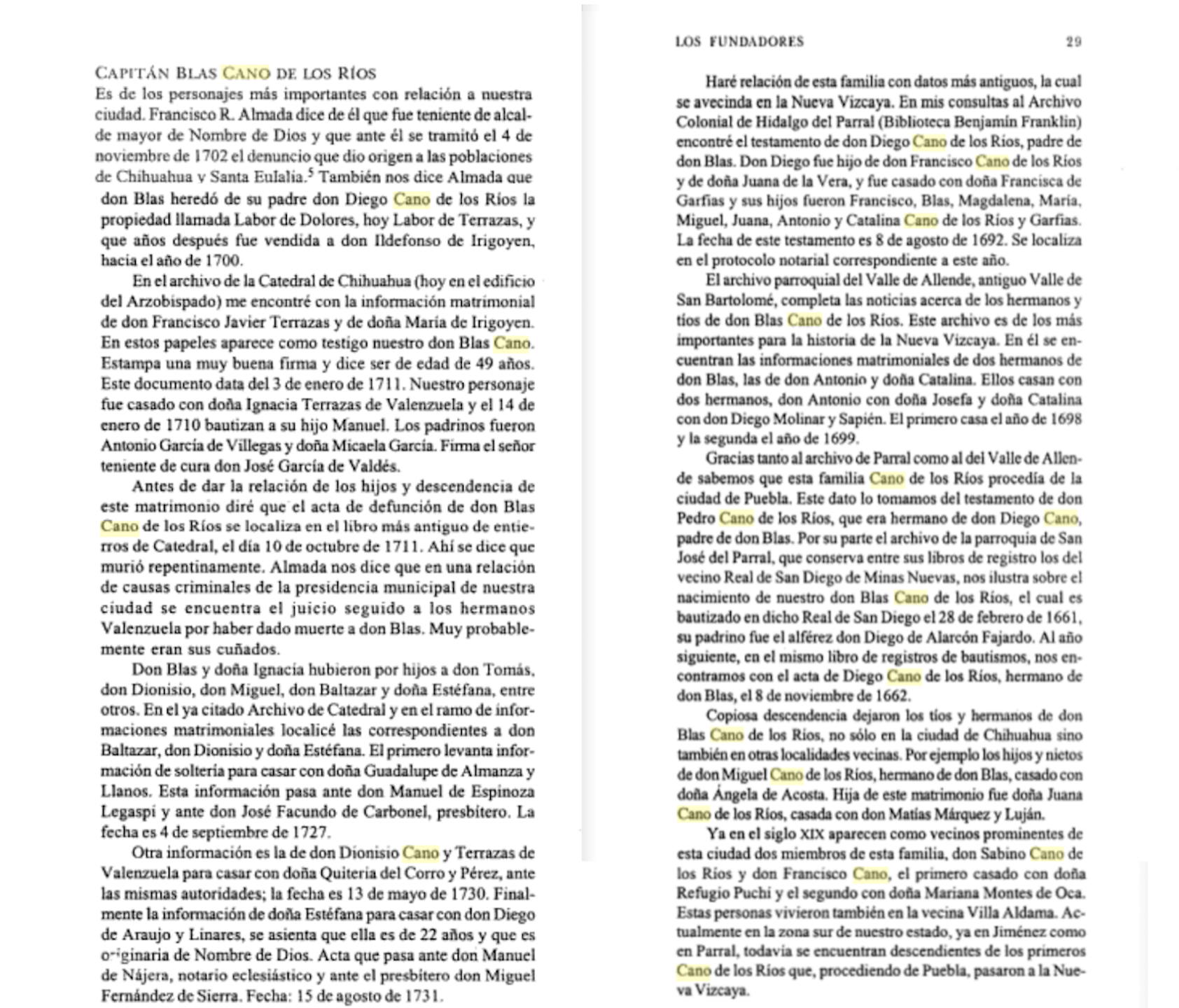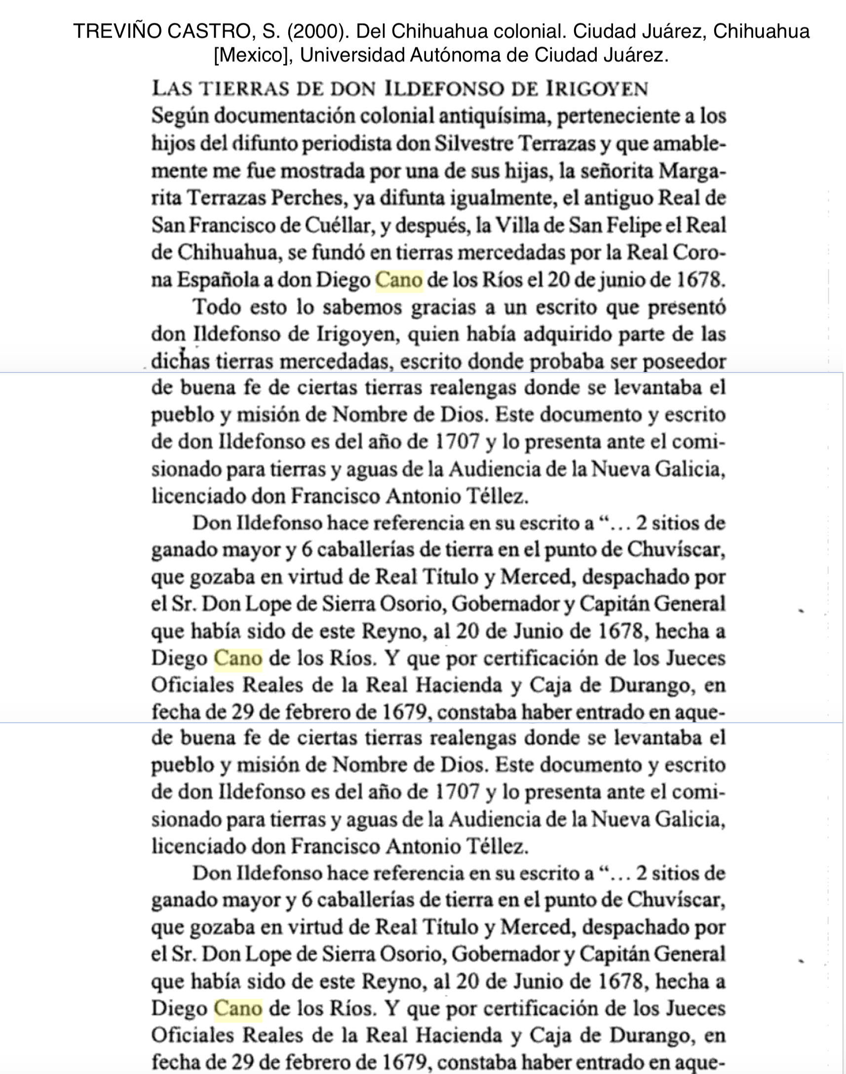 | Fact | Treviño Castro, S. (2000). Del Chihuahua colonial. Mexico: Universidad Autónoma de Ciudad Juárez. Treviño Castro's book gives many details about Blas Cano, most of the information taken from the Archives of Parral and from the Catholic Church records of San Bartolome and of Chihuahua.