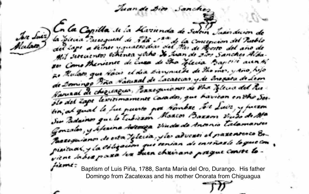 Luis PIÑA Baptism: August 24, 1788 — Santa Maria del Oro, Santa Maria del Oro, Durango, Mexico |