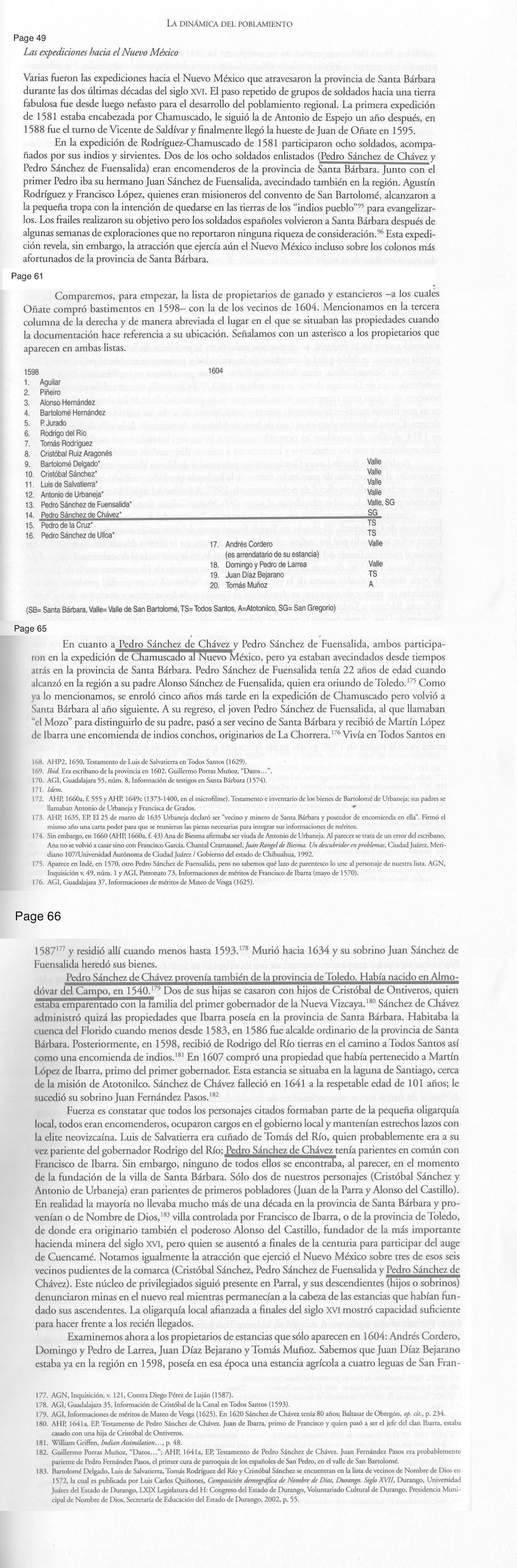 | Event | Pedro Sanchez (Saenz) was one of 8 soldiers from the Santa Barbara area of Nueva Vizcaya who signed up for the Chamuscado Expedition to New Mexico. Pedro did not remain in New Mexico for long - he was back in Santa Barbara in 1582. "En la expedición de Rodriguez-Chamuscado de 1581 participaron ocho soldados acompañados por sus indios y sirvientes. Dos de los ocho soldados enlistados (Pedro Sánchez de Chávez y Pedro Sánchez de Fuensalida) eran encomenderos de la provincia de Santa Bárbara. Junto con el primer Pedro iba su hermano Juan Sánchez de Fuensalida, avecindado también en la región. Agustín Rodríguez y Francisco López,quienes eran misioneros del convento de San Bartolomé, alcanzaron a la pequeña tropa con la intención de quedarse en las tierras de los "indios pueblo"95 para evangelizarlos. Los frailes realizaron su objetivo pero los soldados españoles volvieron a Santa Bárbara después de algunas semanas de exploraciones que no reportaron ninguna riqueza de consideración.% Esta expedicion revela, sin embargo, la atracción que ejercía aún el Nuevo México incluso sobre los colonos más afortunados de la provincia de Santa Bárbara." |