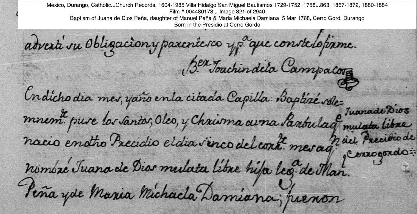Baptism of a daughter | Juana de Diós PEÑA March 5, 1768 Note: Born in the Presidio at Cerro Gordo. Juana de Dios Peña, daughter of Manuel Francisco Peña and Maria Micaela Damiana. 5 Mar 1768.