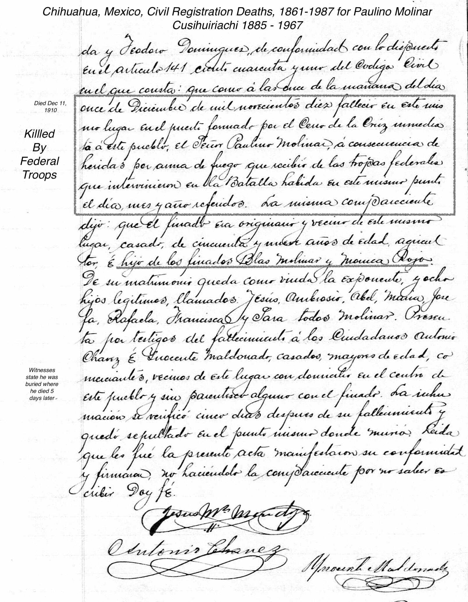 Death of a brother | Paulino MOLINAR December 11, 1910 (Age 53 years) Age: 59 Note: Witnesses state Pauline Molinar was killed by Federal Troops in a Battle on Cerro De la Cruz near Ce… |