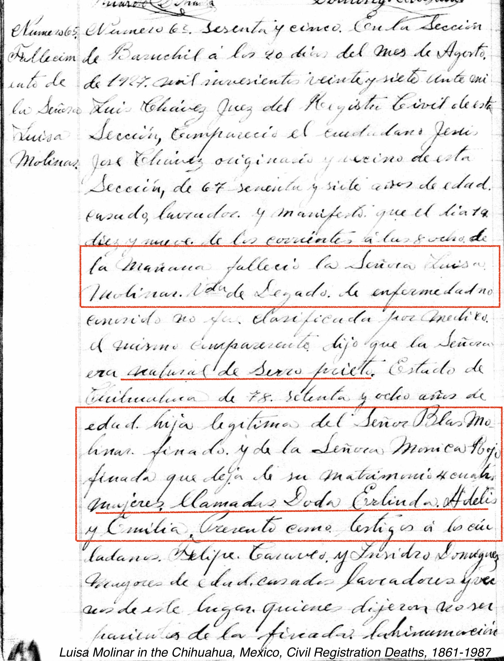 Luisa MOLINAR Birth: 1849 18 — Cerro Prieto, Chihuahua, Mexico Death: August 20, 1927 — Basúchil, Chihuahua, México |