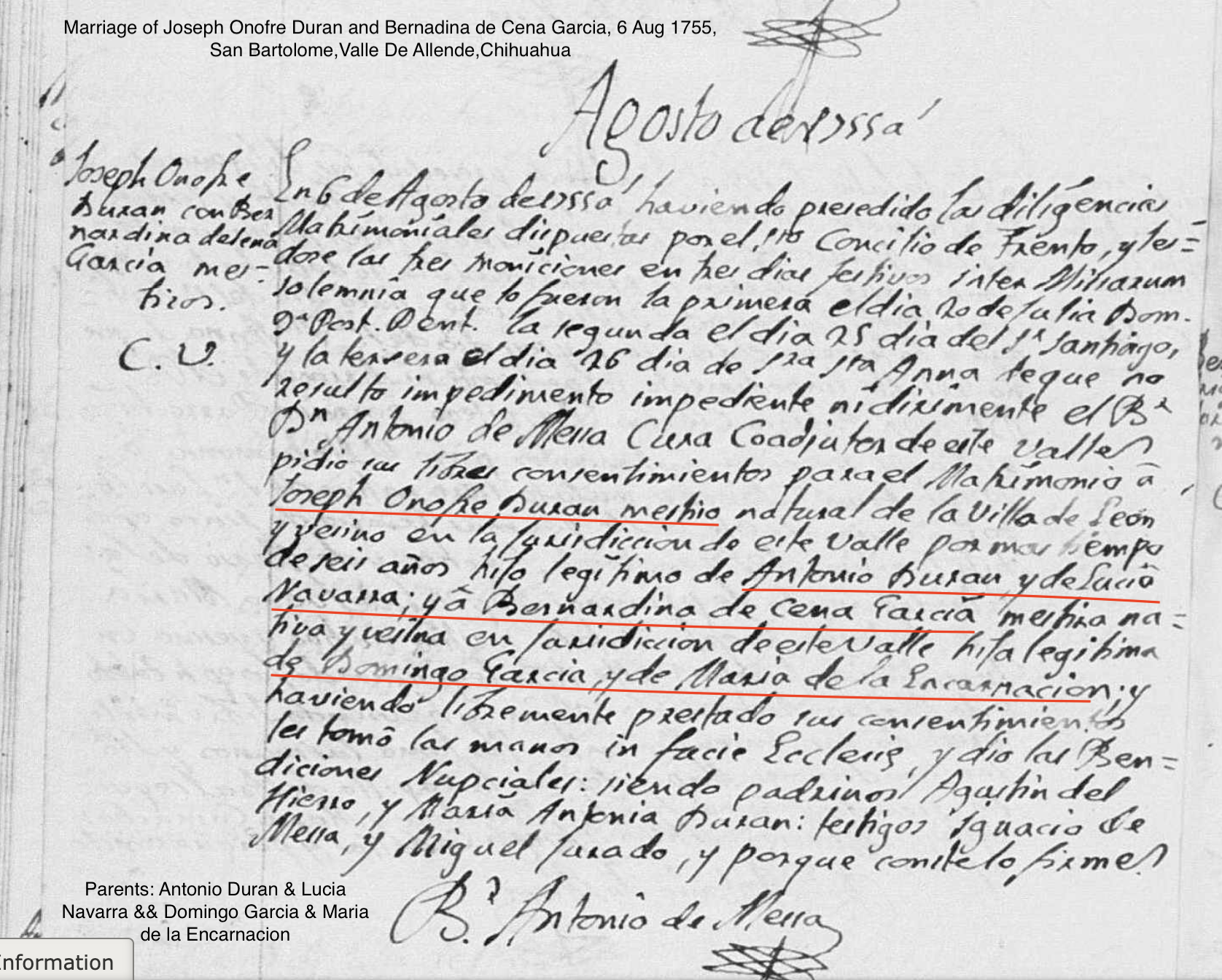 | Note | Named in the marriage of their son Jose Onofre Duran in 1755. |
