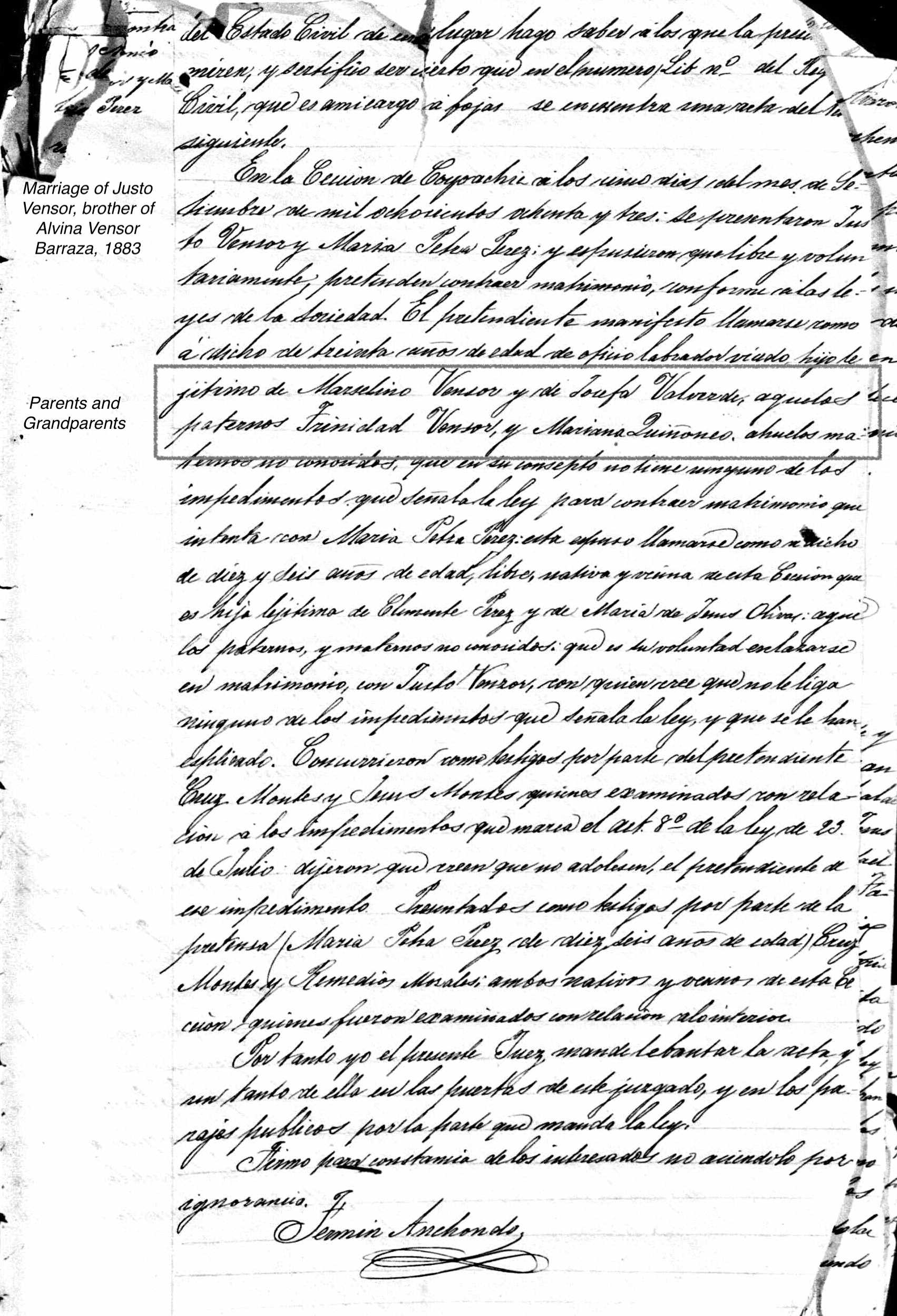 | Event | Chihuahua, Mexico, Civil Registration Marriages, 1861-1967 For Justo Vensor Age: 30 Birth Year: abt 1853 Registration or Marriage Date: 5 sep. 1883 Registration or Marriage Place: Coyachic, Chihuahua, México (Mexico) Spouse: Maria Petra Perez Father: Marselino Vensor Mother: Josefa Valorrde |