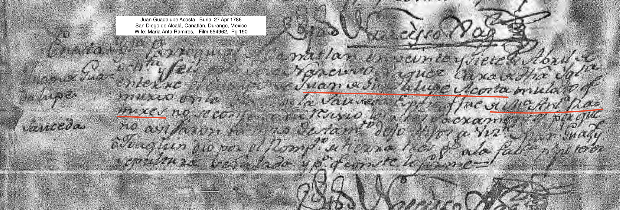| Burial | Durango, Mexico, Catholic Church Records, 1604-1985 For Juan Guadalupe Acosta Gender: Hombre (Male) Record Type: entierro (Burial) Death Date: abt 1786 Burial Date: 27 abr. 1786 (27 Apr 1786) Burial Place: San Diego de Alcalá, Canatlán, Durango, Mexico Spouse: MA Antonia Ramires Page Number: 190 |