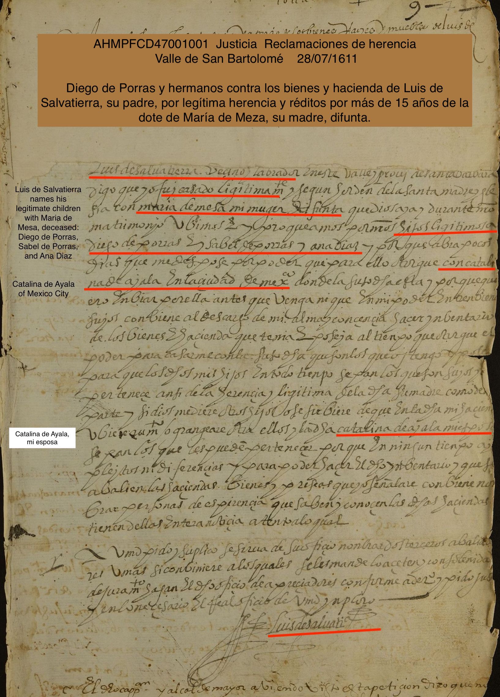Marriage | Maria de MESA — View this family yes Diego de Porras Lawsuit to Reclaim His Inheritance Names Children of Luis Salvatierra and Maria de Mesa Note: Luis Salvatierra also states that his present wife is Cathalina de Ayala