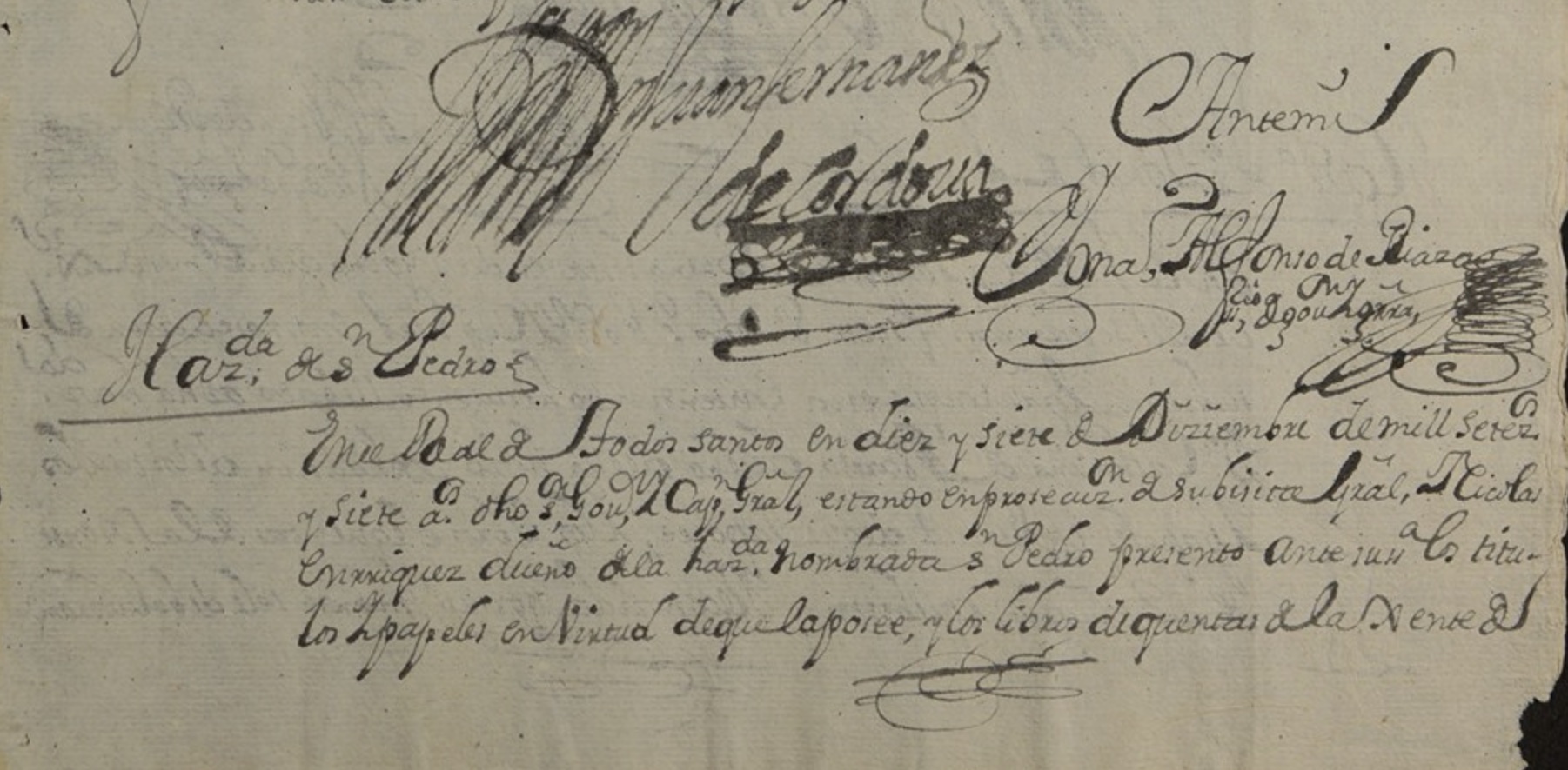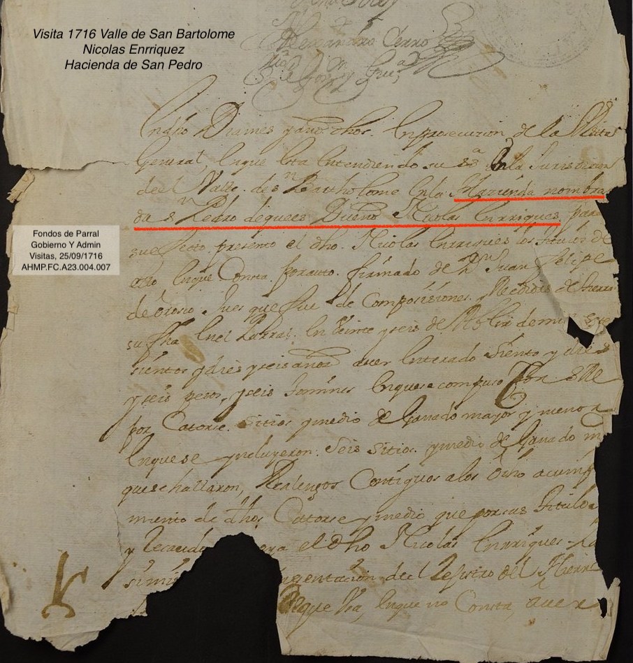 Residence | December 1707 Note: This record is additional evidence that Nicolas Enrriques, the owner of Hacienda San Pedro, was the … |