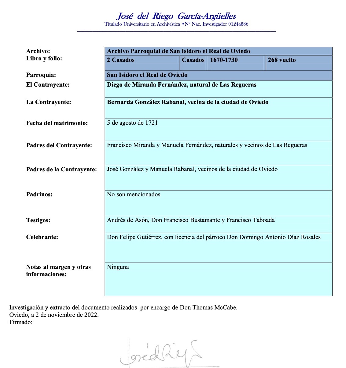 | Marriage | Padres: Francisco Miranda & Manuela Fernández, naturales y vecinos de Las Regueras && Jose Gonzáles & Manuela Rabanal, vecinos de ciudad de Oviedo |