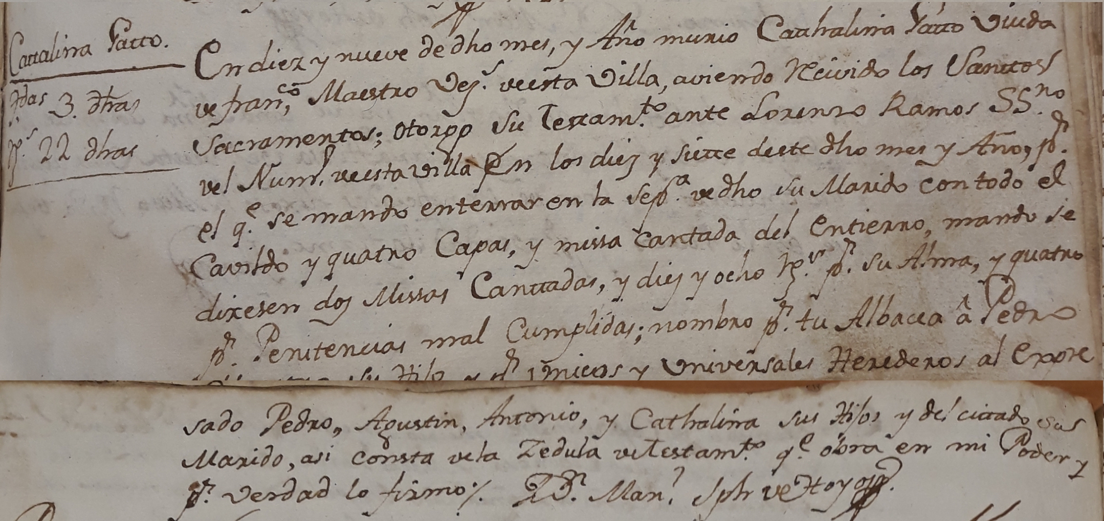 Death of a sister | Catalina GATO DÍEZ September 19, 1779 (Age 64 years) Note: Recibió los Santos Sacramentos. Testó ante el escribano del número de Melgar Don Lorenzo Ramos, el 1… |