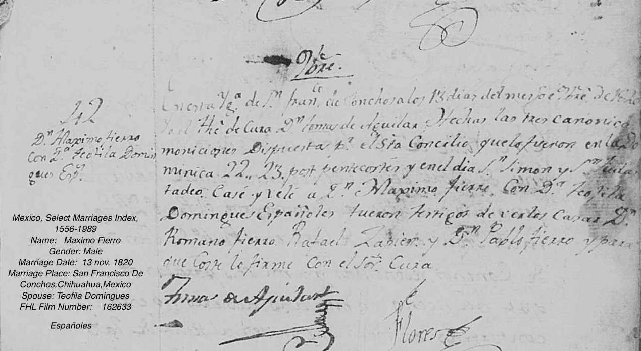 | Marriage | Mexico Marriages, 1570-1950 Name: Nicolas Anto. Hierro Spouse's Name: Ma. Petra Ronquillo Event Date: 21 May 1778 Event Place: San Bartolome,Valle De Allende,Chihuahua,Mexico Españoles. |