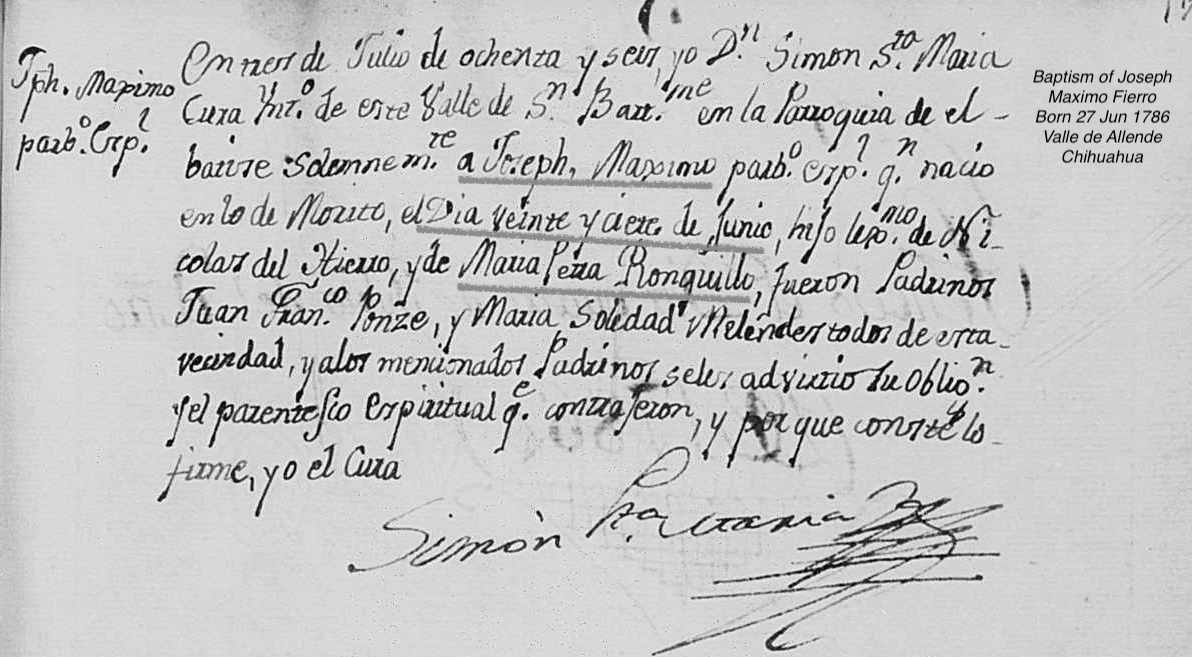 Joseph Máximo FIERRO Birth: June 27, 1786 29 26 — Valle De Allende, Chihuahua, Mexico Burial: September 29, 1853 — San Bartolome, Valle De Allende, Chihuahua, Mexico |