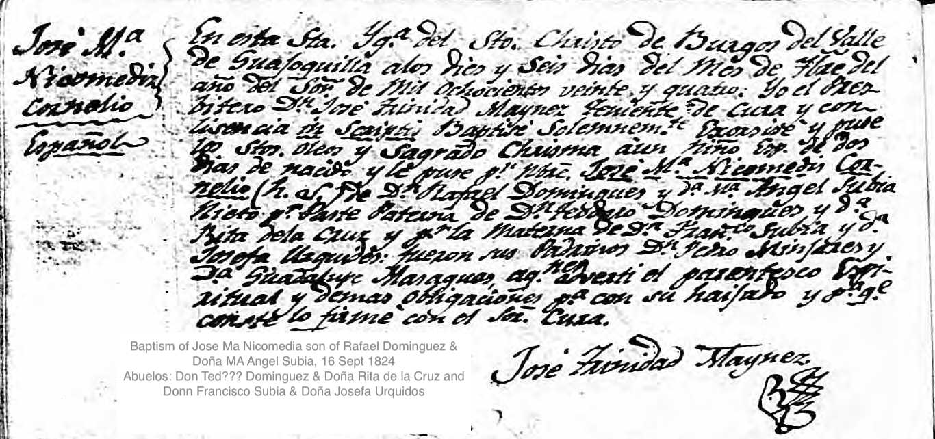 Baptism of a son | José María Nicomedis Cornelio DOMINGUEZ SUBIA September 16, 1824 |