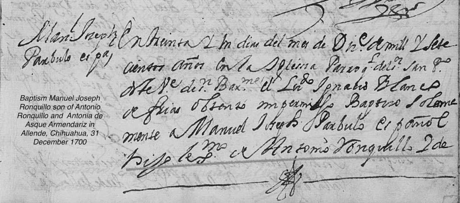 Manuel Joseph RONQUILLO Baptism: December 31, 1700 23 21 — San Bartolome, Valle De Allende, Chihuahua, Mexico |