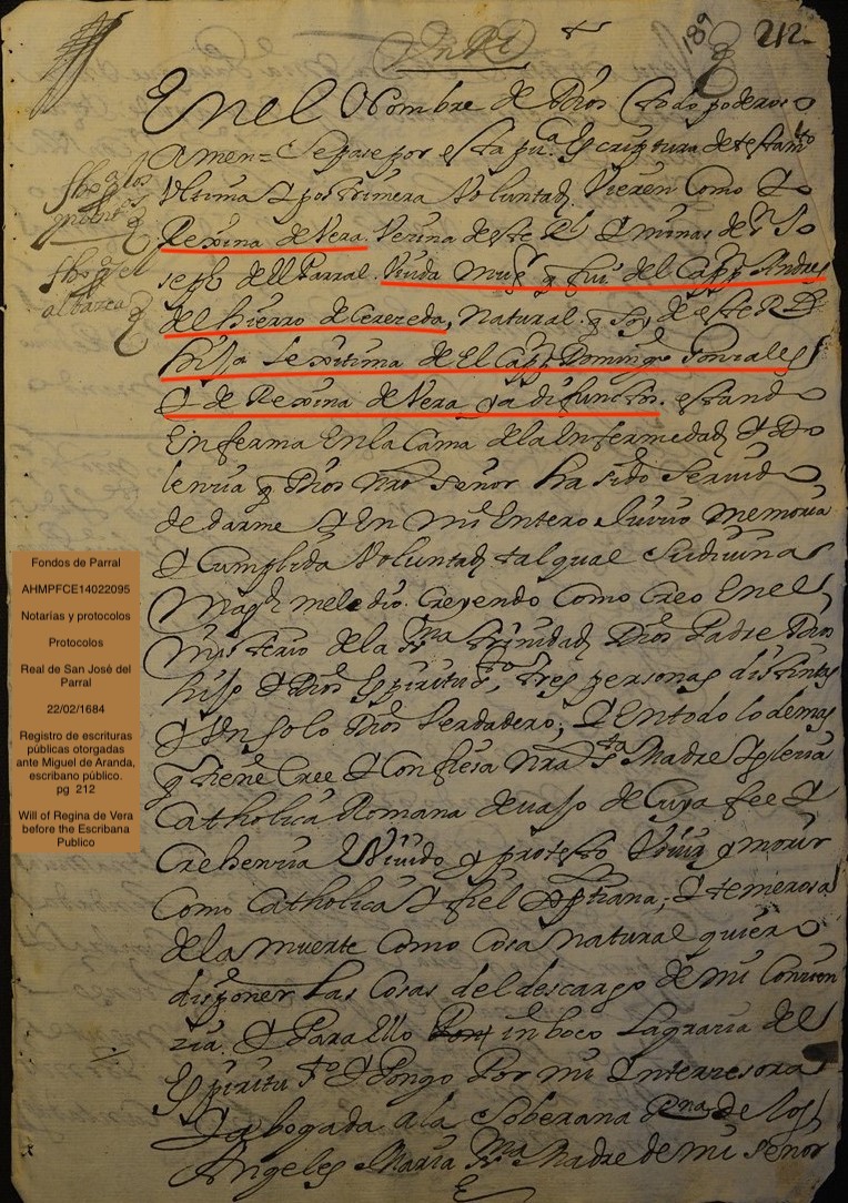 | Note | The will of Regina de Vera in 1685 named her son in law Bernardo de Asque y Armendariz as executor of her estate and guardian of her minor children. The children mentioned are Lope, Maria, Ana, Beatriz, Andes, Pedro, Juan and Antonia. |