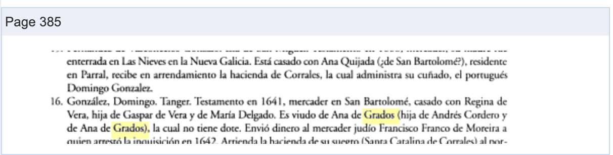 | Note | Antonia & Regina Gonzales de Vera/Captain General Bartolome & Captain Andres del Hierro Zereceda Grados Posted 20 Feb 2011 by PatErnieAlderete on ancestry.com (Added by me: We descend through Andres and Regina in the following story.) Captain General Bartolome del Hierro y Zereceda Grados born about 1620s- Parral-Chihuahua. Captain/Capitan Andres del Hierro y Zereceda Grados born about 1620s-30s- Parral-Chihuahua. Antonia Gonsales Vera baptizeda November 16, 1637 Parral-Chihuahua: “I baptized Antonia, (Spanish in margin) daughter of Captain Domingo Gonzales and of his legitimate woman Rejina Vera, godparents (illegible).” Regina Gonzales de Vera born March 3, 1638 Parral-Chihuahua (#o162529) Two sisters, Antonia and Regina Gonzales de Vera married two brothers, Bartolome and Andres Hierro Zereceda in 1651, and 1658 Parral. Regina Gonzales de Vera married Andres del Hierro April 19, 1651 Parral-Chihuahua Andres is listed as a farmer, and neighbor from Valle de Allende, Regina's father, Domingo Gonzales, listed as deceased by the time of marriage, witnesses Maria Gonzales and Francisco de Lima. Francisco de Lima who was born in Villaviscosia, Portugal, and was previously godfather at the 1642 Parral baptism of Josepha de Vera, Regina's younger sister. Francisco de Lima married Maria Gonzales de Vera 1644 Parral. All reinforcing the Portuguese cultural impact we know affected the Gonzales family. March 31, 1655 Captain Andres del Hierro y Zereceda commanded to prepare for war against the Toboso Nation Antonia Gonzales de Vera married Bartolome Hierro Y Zerecede September 9, 1658 Parral-Chihuahua: "Bartolome del Hierro from this Valley of San Bartolome and Antonia Gonzales (Spanish in the margin) daughter of the late Domingo Gonzales, and of Regina de Vera, neighbor of this said valley." Again, Francisco de Lima and Maria Gonzales de Vera were present at this wedding, as they were at the previous one listed above. We are equally descended from both sides of this marriage, not only genetically, but genealogically. Regina de Vera and Andres del Hierros' daughter Ana Vera married Diego Olguin. Our ancestor Beatris del Hierro y Zereceda Gonzales baptised/bautisada April 28, 1664 Parral-Chihuahua: “Beatris, Spanish legitimate daughter of Bartolome del Hierro and Antonia Gonzales his legitimate wife, godparents Captain Juan Salaises, and his wife Maria (illegible).” Our ancestor Ana Vera del Hierro Zereceda Gonzales born about 1665 Parral-Chihuahua, daughter of Andres del Hierro y Zereceda and Regina Gonzales. Antonia del Hierro Zereceda Gonzales baptised July 2, 1673 Parral-Chihuahua. Parents Andres del Hierro/Regina de Vera Bernabe Domingo Hierro Bera baptised June 16, 1675 Valle de Allende-Chihuahua. Parents Andres del Hierro/Regina de Vera Bartolome del Hierro Zereceda February 16, 1684 Parral-Chihuahua Will establishes his death, notes wife Antonia Gonzales de Vera, his father Lope Hierro de Sereceda, mother Beatris Grados, his brothers, nephew, niece, son in law, daughters. Andres del Hierro y Zereceda married Ana Moreno September 13, 1696 Valle de Allende-Chihuahua. Andres del Hierro Zereceda deceased, and Regina Vera verified as parents of Ana Bera in Ana's April 16, 1697 Parral-Chihuahua marriage to Diego Olguin. Antonia Gonzales de Vera December 1, 1698 Parral-Chihuahua will verifies her parents, mother and father in law, dates and places of birth, death, marriage to Captain General Bartolome Hierro Y Zereceda, their five daughters: Maria, Luisa, Micaela, our ancestor Beatris, and Geronima. |