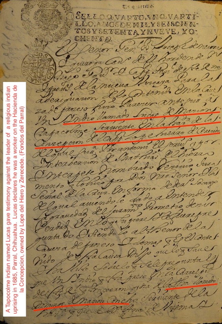 | Event | Source: Fondos del Parral AHMPFCC11009099 Milicia y guerra Sediciones Real de San José del Parral 03/02/1685 Contra un indio llamado Domingo y por otro nombre Moctezuma, de nación concho, por ser el motor de todos los daños que se hicieron por los indios enemigos. Indian witnesses who lived on Lope del Hierro's haciendas gave testimony against the leader of a religious uprising named Domingo. See pg 12 of INDIAN ASSIMILATION IN THE FRANCISCAN AREA OF NUEVA VIZCAYA, William Griffin, U of Arizon Press. |