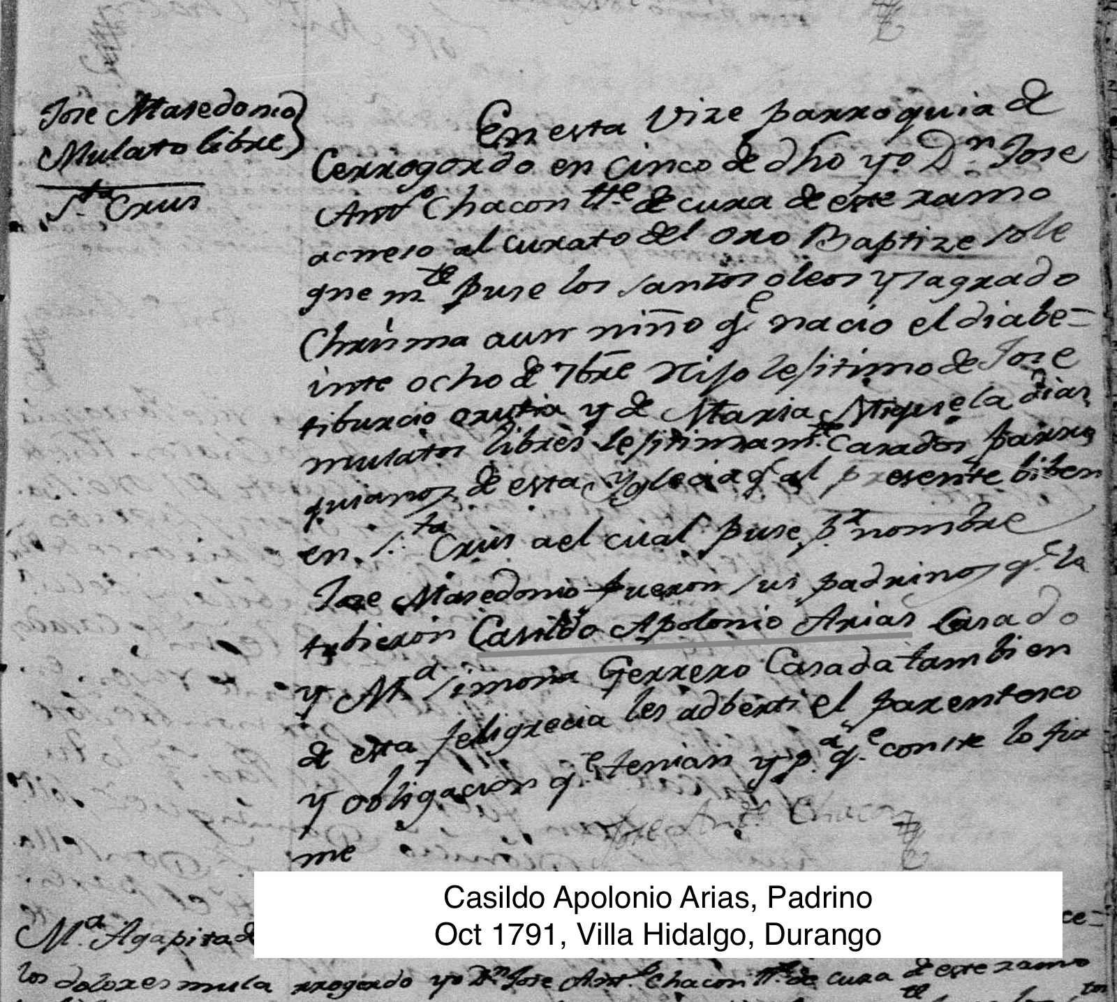 | Name | His 1786 marriage record gives his name as Jose Polonio Arias, of Rio Florido. On 5 Oct 1791 he was named Casildo Apolonio Arias, a witness to the baptism of Jose Macedonio in Cerro Gordo. In the 1789 baptism of his daughter Maria de la Lus he was named Casildo Duran. In the 1792 burial record of his son Jose Arias he was named Casildo Arias as he was in the baptism and burial records of his daughter Antonia in 1795. In the burial record of his wife Juana de Dios Peña in 1833 he was named Casildo Arias. In the Nov 3, 1839 baptism record of his granddaughter Maria de los Santos Garcia in Jimenez he was named Cacildo Arias. |