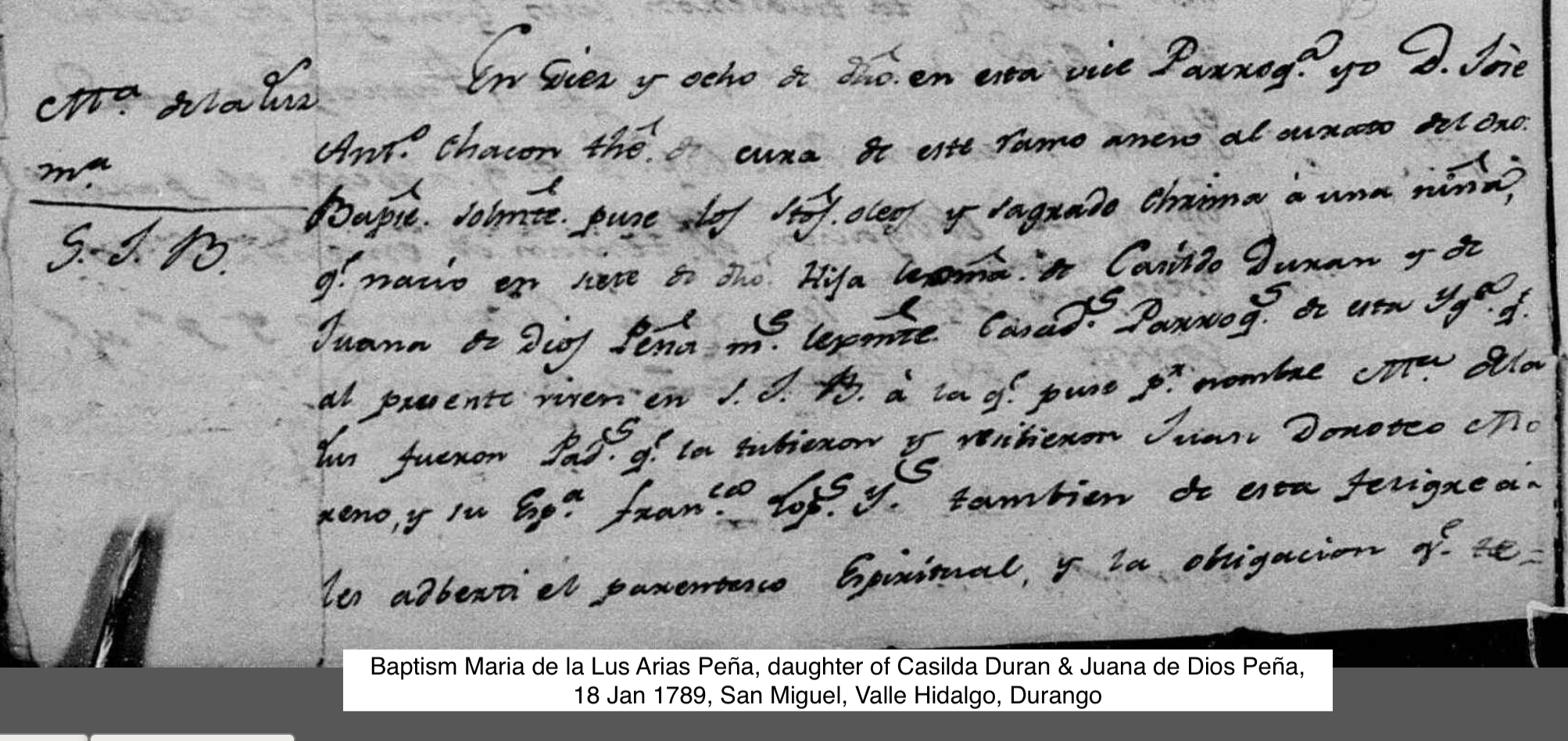 Maria de la Lus ARIAS PEÑA Baptism: January 18, 1789 32 20 — San Miguel, Villa Hidalgo, Durango, Mexico |