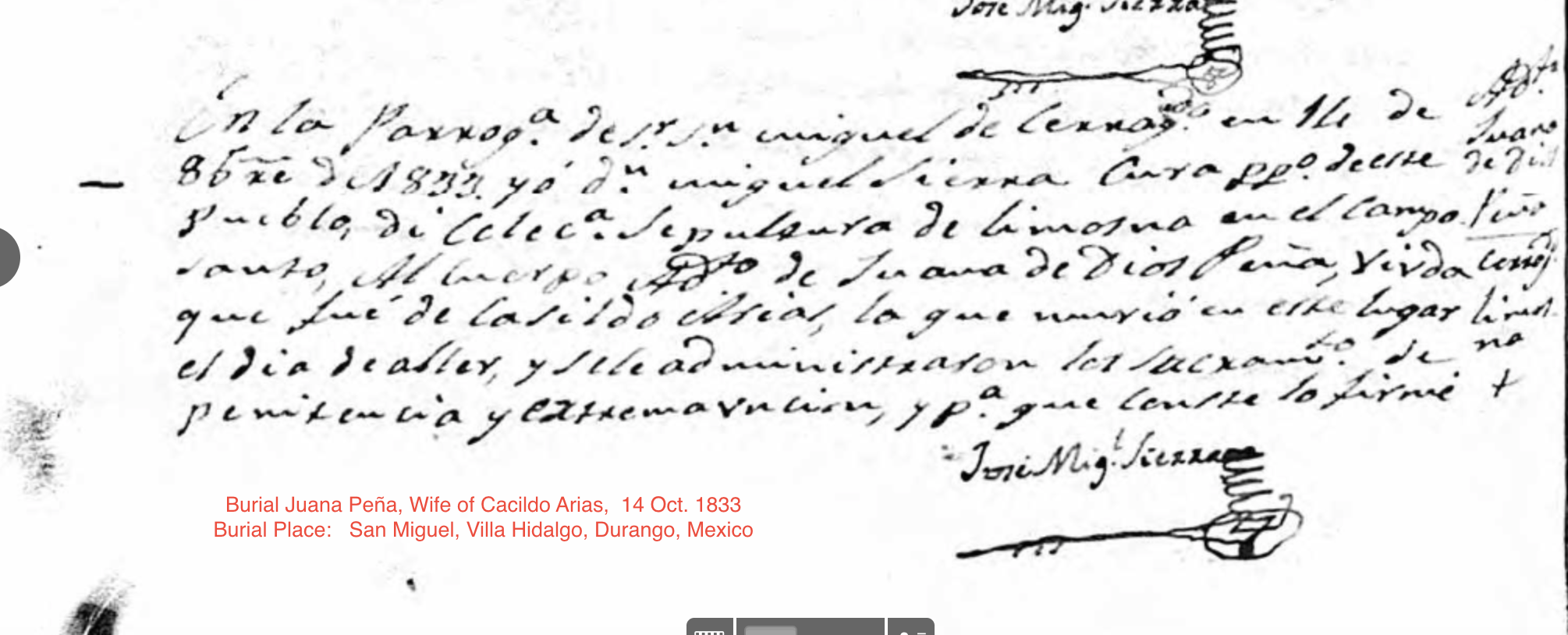 | Note | This could be the parents of Valentina Arias:: Durango, Mexico, Catholic Church Records, 1604-1985 For Juana de Dios Peña Gender: Mujer (Female) Record Type: entierro (Burial) Death Date: abt 1833 Burial Date: 14 Oct. 1833 Burial Place: San Miguel, Villa Hidalgo, Durango, Mexico Spouse: Casildo Arias Page Number: 106 |
