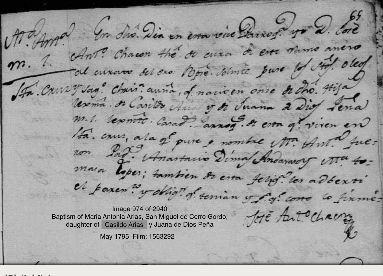 Maria Antonia ARIAS Baptism: May 1795 39 27 — San Miguel de Cerro Gordo, Durango (Now Villa Hidalgo) Hidalgo Burial: June 21, 1795 — San Miguel, Villa Hidalgo, Durango, Mexico |