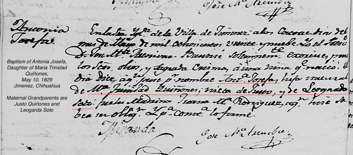 | Baptism | Mexico, Select Baptisms, 1560-1950 Antonia Josefa Quinones Birth Date: 10 may. 1829 Baptism Date: 14 may. 1829 Baptism Place: Santo Cristo DE Burgos,Jimenez,Chihuahua,Mexico Mother: MA. Trinidad Quinones FHL Film Number: 162500 Maternal Grandparents: Justo (Quiñones) and Leogarda Soto |