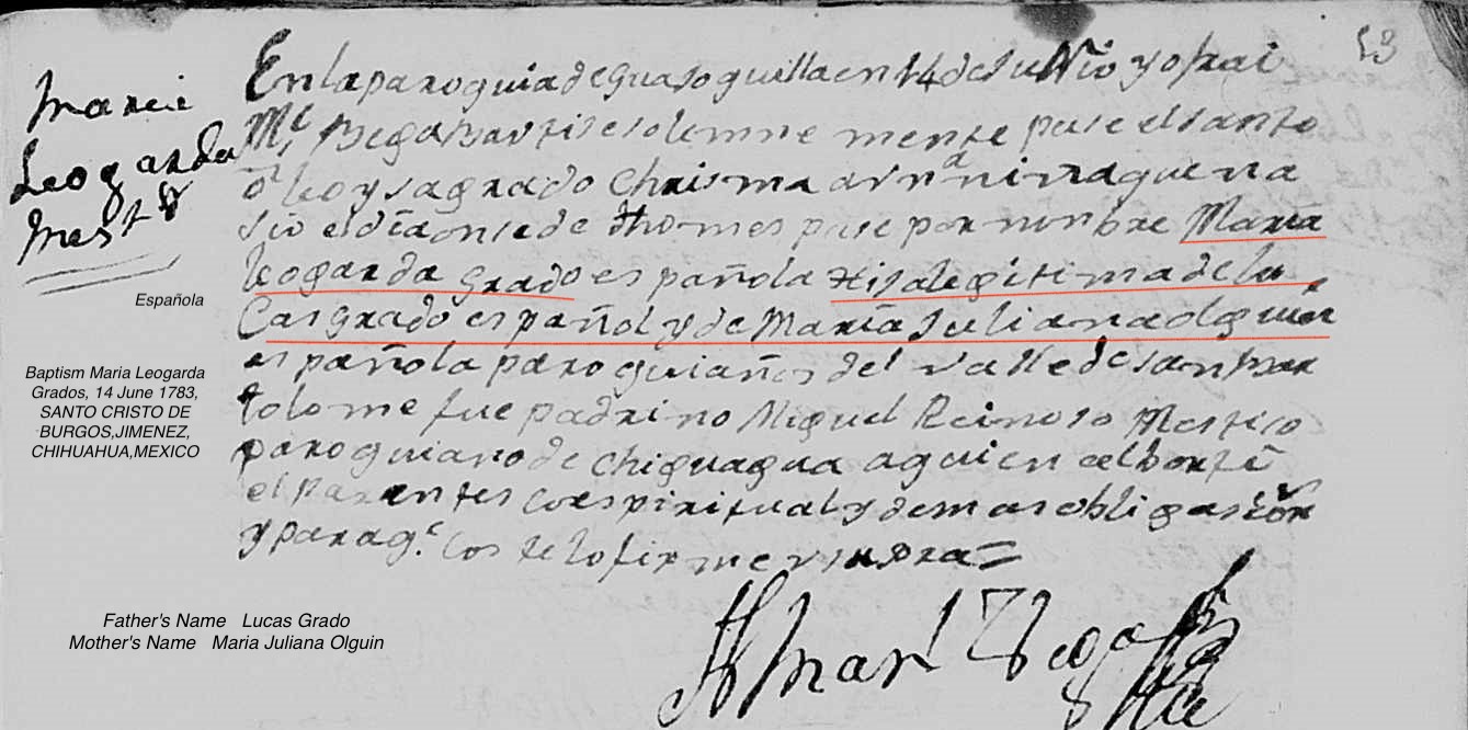 Maria Leogarda GRADO Baptism: June 14, 1783 41 39 — Santo Cristo de Burgos, Jimenez, Chihuahua, Mexico |