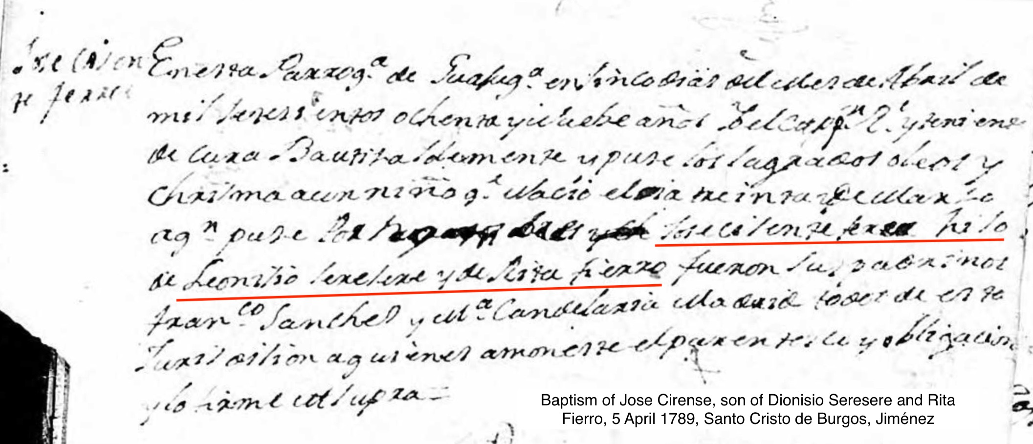 | Note | Named in the baptism records of their granddaughters Maria Trinidad Cobos Serecede in 1825 and Maria Bernabé in 1822. |