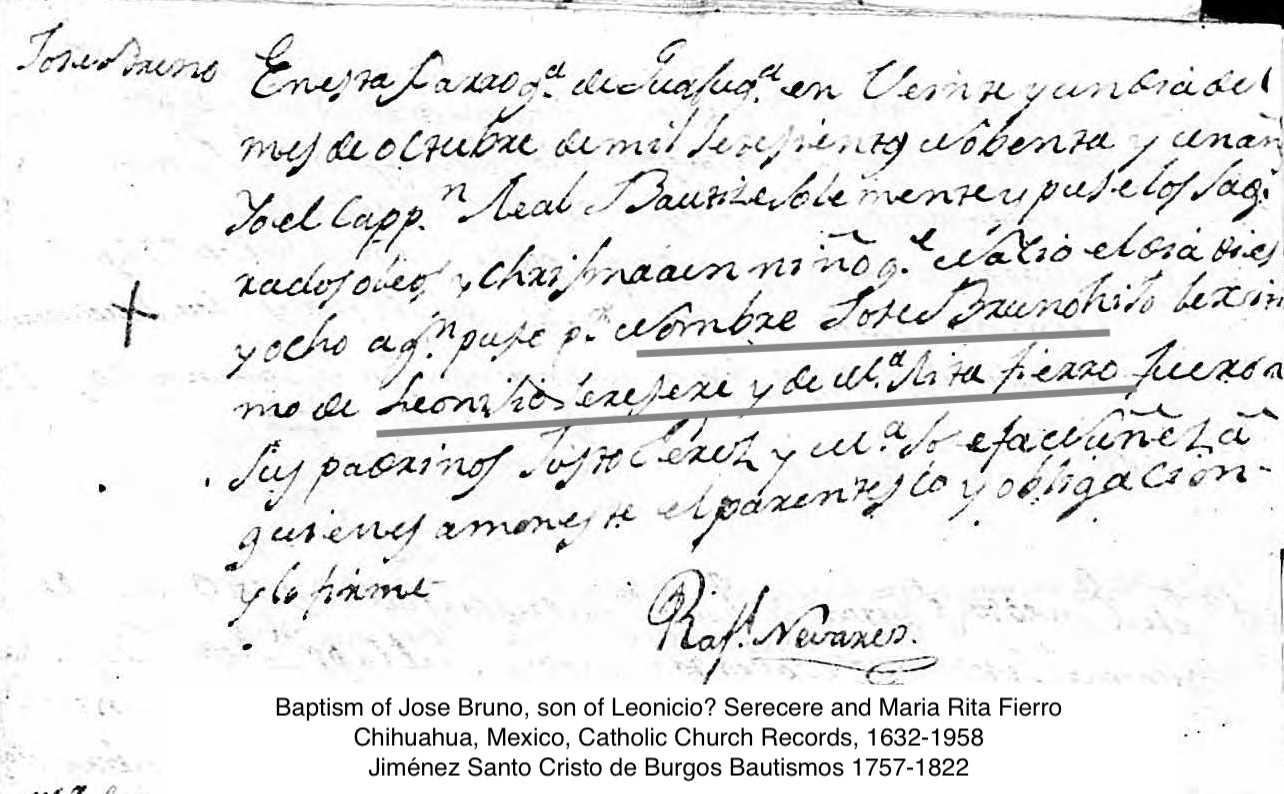 Jose Bruno CERESERE FIERRO Baptism: October 21, 1791 — Santo Cristo de Burgos, Jimenez, Chihuahua, Mexico |