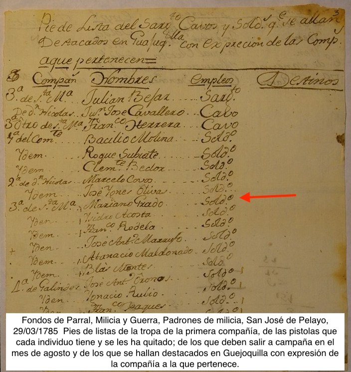 | Military | UAir Collections › Documentary Relations of the Southwest › Biofile GRADO, MARIANO BID Number 5904 Birth N.D.: RIO FLORIDO Occupation 1778 Sep 08: PARRAL/(ENLISTED, 2ND COMP. 1ST SQUAD.DRAGONES PROVINCIALES DE SAN CARLOS) Family GRADO, LUCAS (F)OLGINA, ANA ROSA (M) Notes AGE LISTED 23 Source PRIMARY SOURCE Sources AZU FILM 318, PARRAL 1790 B, FR. 934 |
