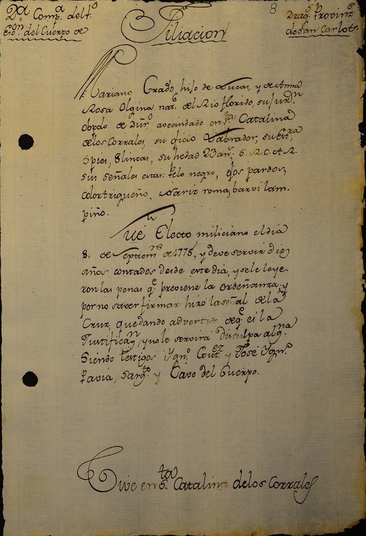 Military | 2ND COMP. 1ST SQUAD.DRAGONES PROVINCIALES DE SAN CARLOS September 8, 1778 (Age 23 years) |