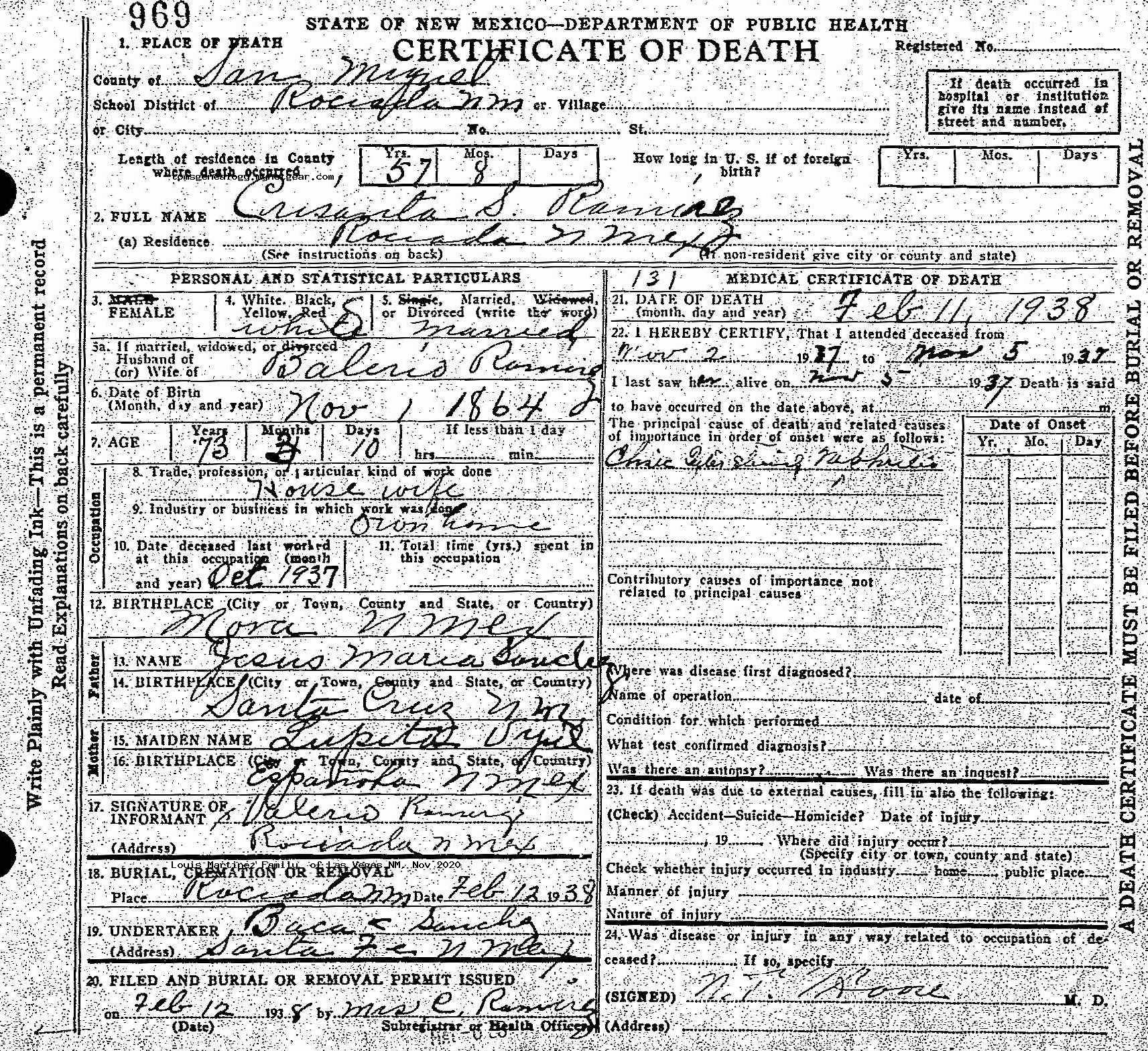 Valerio S RAMIREZ Birth: July 25, 1865 — Peña Blanca, New Mexico Death: December 28, 1940 — Rociada, San Miguel, New Mexico |