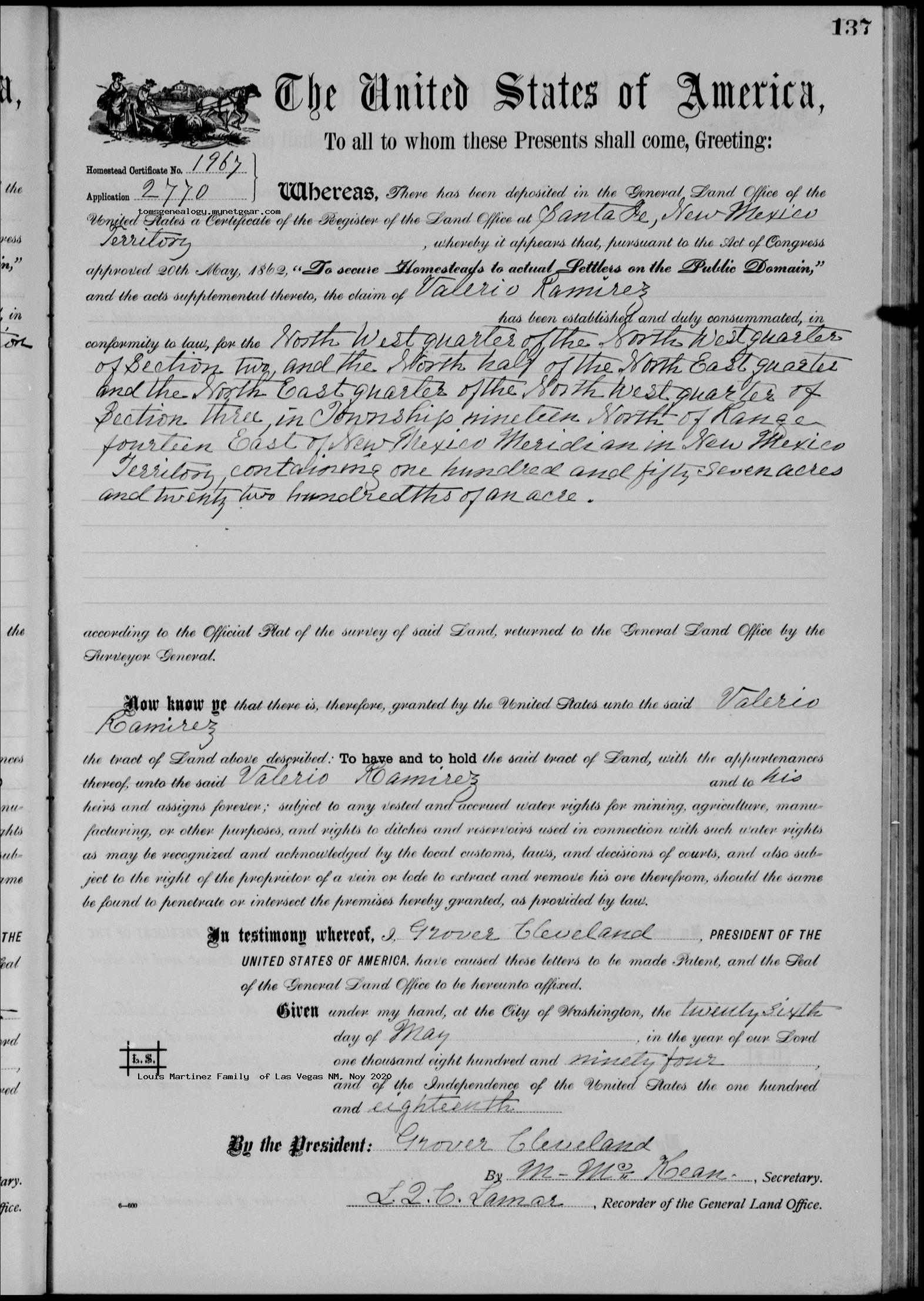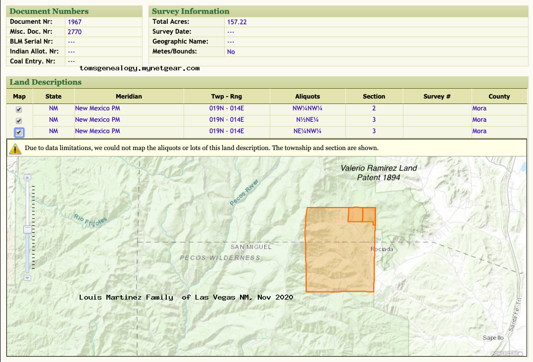 | Property | Valerio Was Granted a Land Patent in 1894 in Mora County near Rociada, NM. |