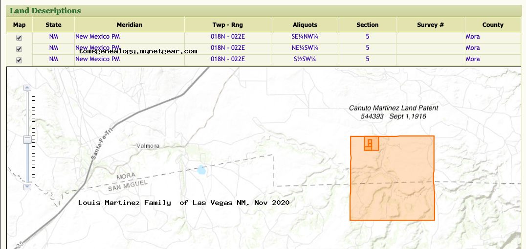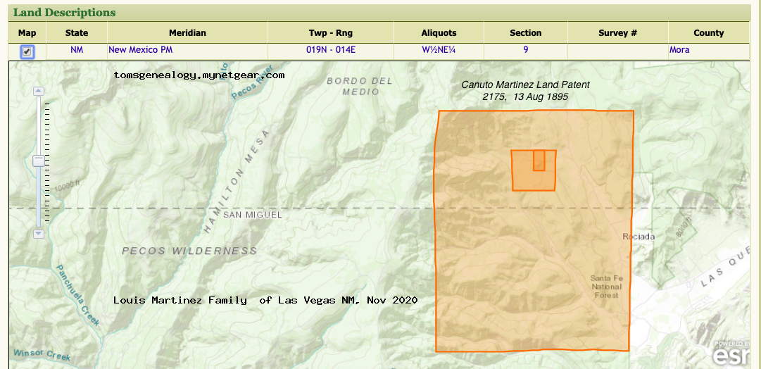 Property | 1895 (Age 29 years) Note: Canuto Martinez received his first land patent on the San Miguel/Mora County boundary near Rociada in 1895.