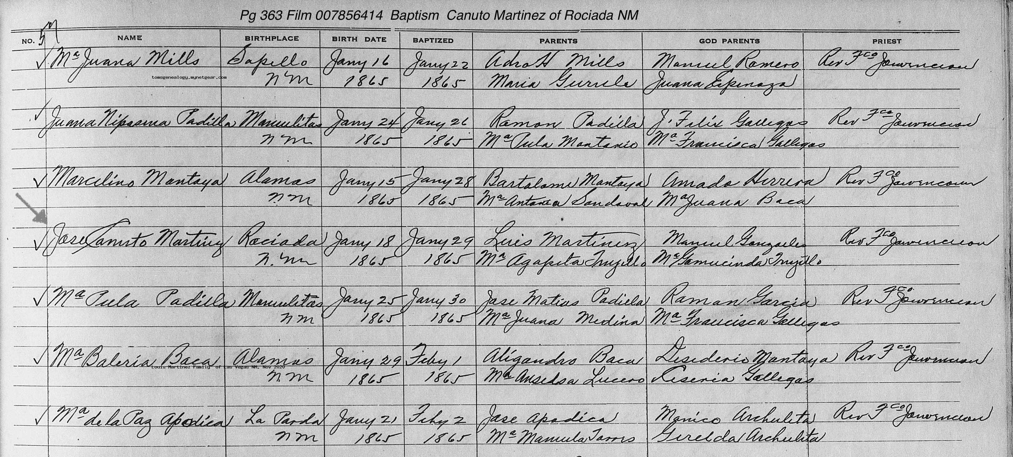 Jose Canuto MARTINEZ Baptism: January 29, 1865 39 32 — Sapello, New Mexico |