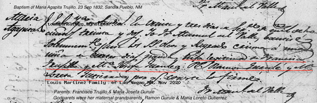 Maria Agapita TRUJILLO Baptism: September 23, 1832 22 — Nuestra Señora de los Dolores, Sandia Pueblos, SANDOVAL, New Mexico |