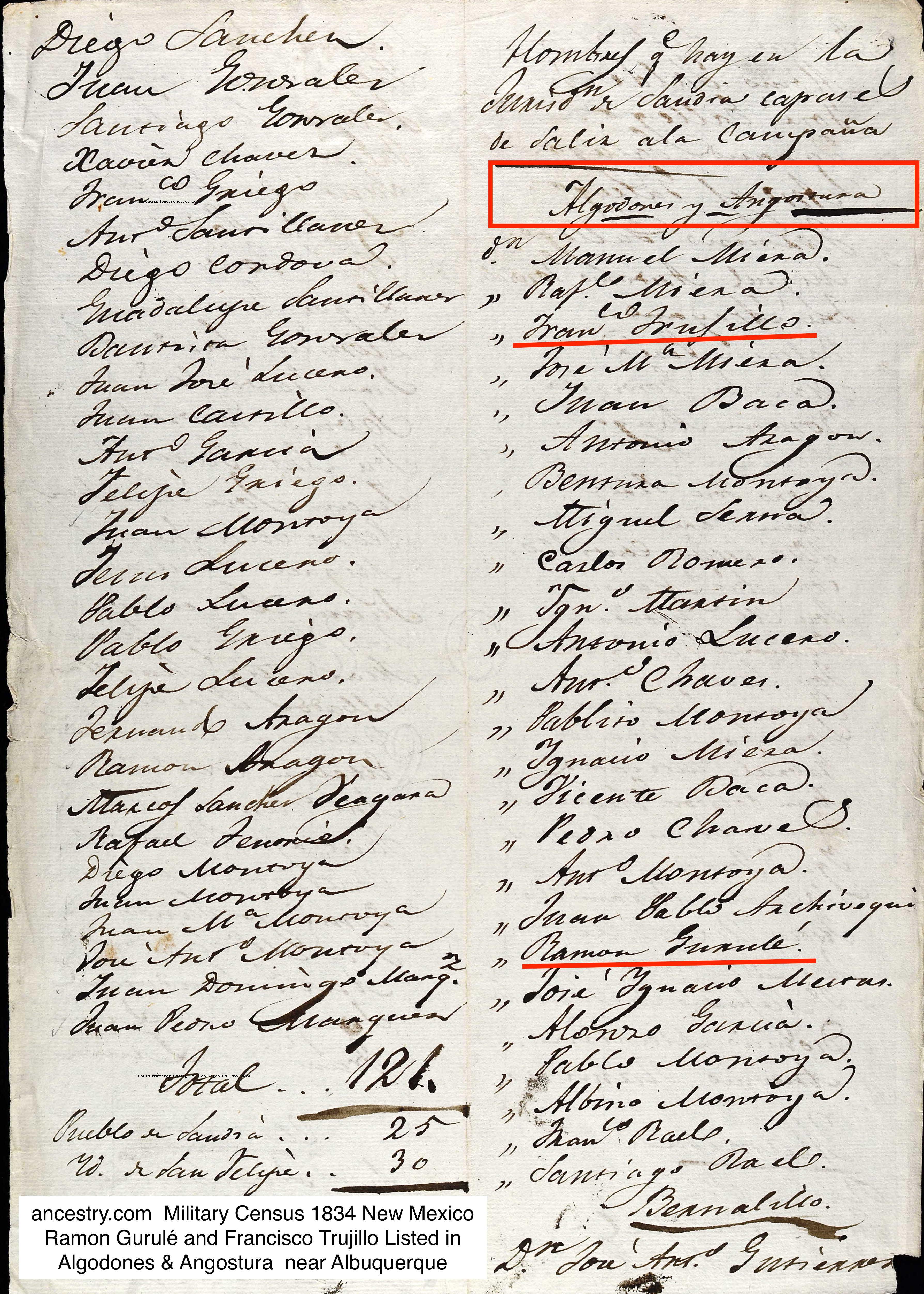 List of Military Age Men near Bernalillo, New Mexico. 1834 Note: Both Ramon Gurulé and his son Francisco Trujillo of Angostura were listed as men available for military service in Nuevo Mexico, Mexico in 1834.