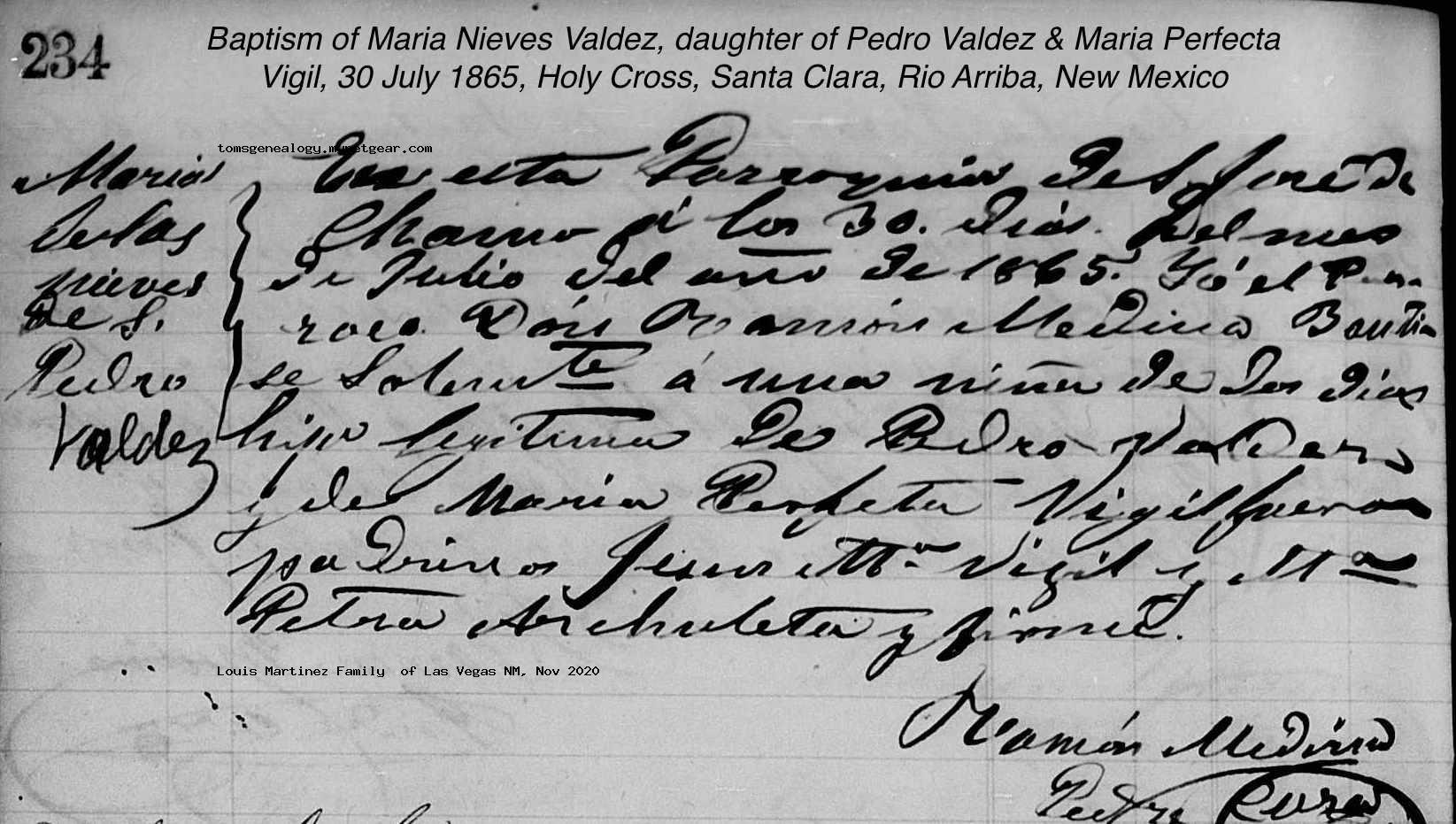 | Baptism | New Mexico Births and Christenings For Maria De Los Nieves Valdez Gender Female Christening Date 30 Jul 1865 Christening Place Holy Cross, Santa Clara, Rio Arriba, New Mexico Father's Name Pedro Valdez Mother's Name Maria Perfeta Vigil |