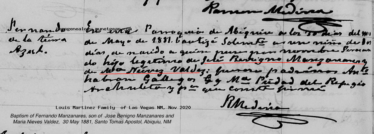 Maximiano MANZANARES Baptism: September 20, 1885 25 20 — Santo Tomás Apóstol, Abiquiu, Rio Arriba, New Mexico Death: |