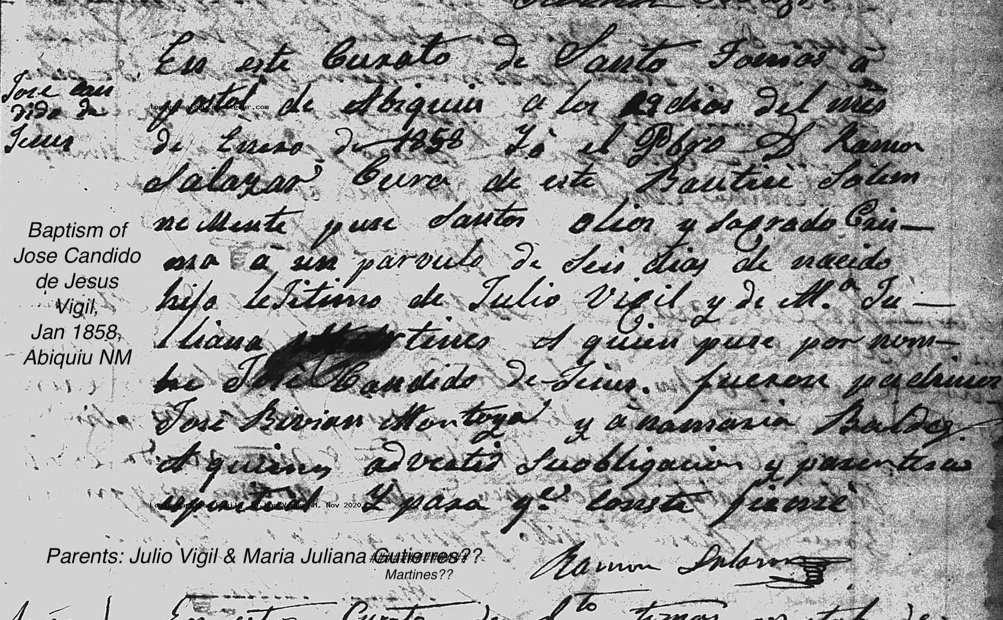 Jose Crecencio VIGIL Baptism: December 18, 1852 — Santo Tomás Apóstol, Abiquiu, Rio Arriba, New Mexico |
