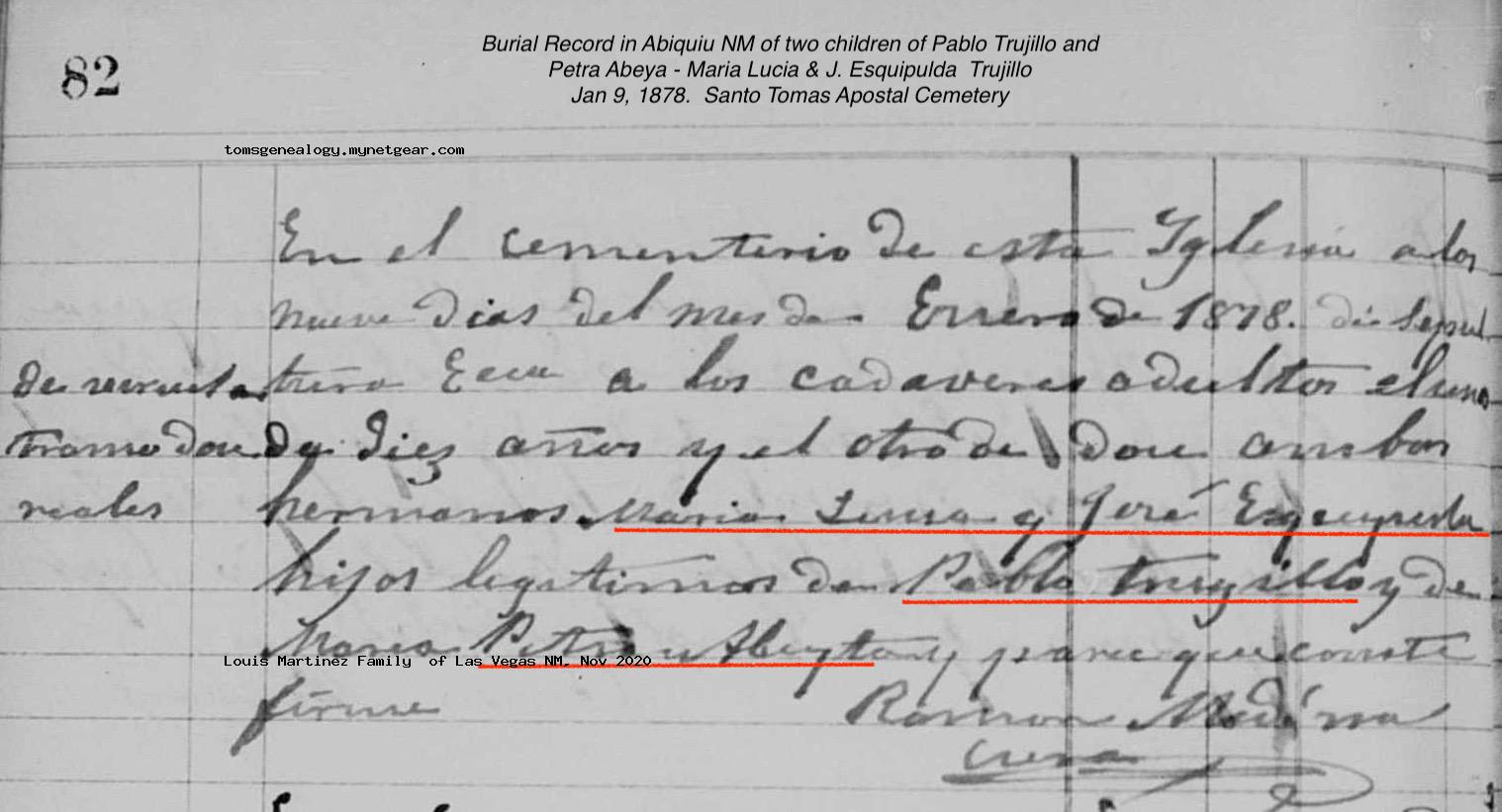 Death of a sister | Maria Lucia TRUJILLO January 1878 (Age 13 years) Note: Burial record in Abiquiu parish records show that two children of Pablo and Petra were buried on the same day, 9 Jan 1878.