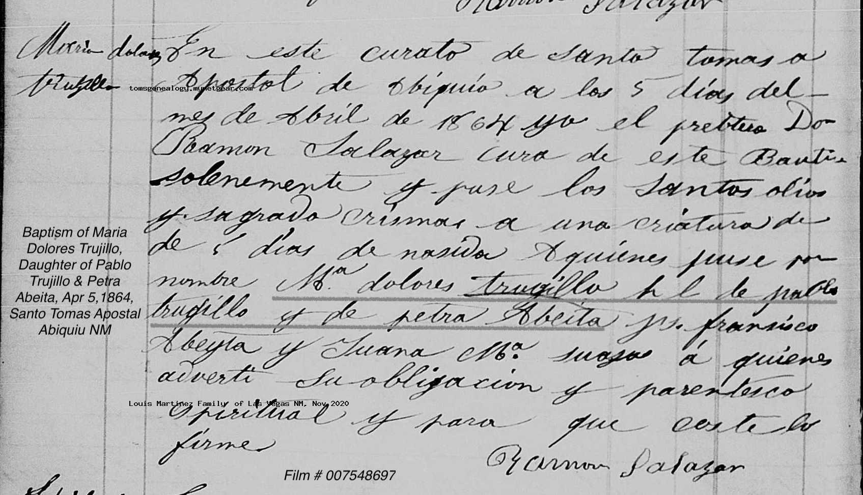 Maria Lucia TRUJILLO Baptism: August 13, 1866 48 32 — Santo Tomás Apóstol, Abiquiu, Rio Arriba, New Mexico Death: January 1878 — Abiquiu, Rio Arriba, New Mexico, USA |