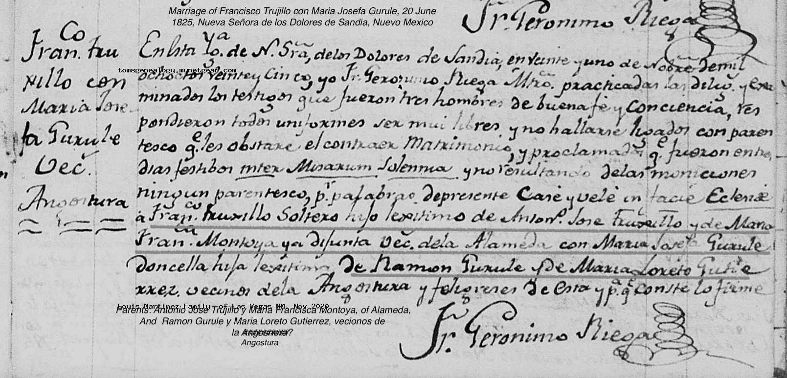 | Marriage | Parents of bride and groom were named: Antonio Jose Trujillo y Maria Francisca Montoya and Ramon Gulure y Maria Loreto Gutierrez. |