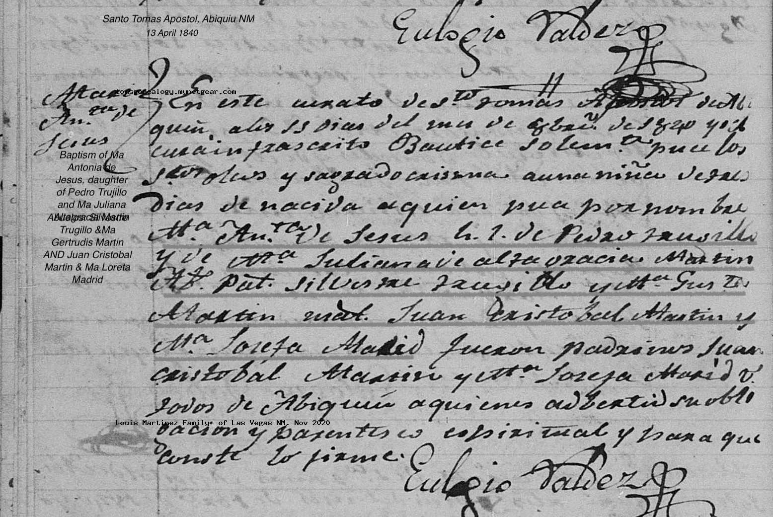Maria Antonia de Jesus TRUGILLO Baptism: April 13, 1840 58 — Abiquiu, Rio Arriba, Nuevo Mexico |