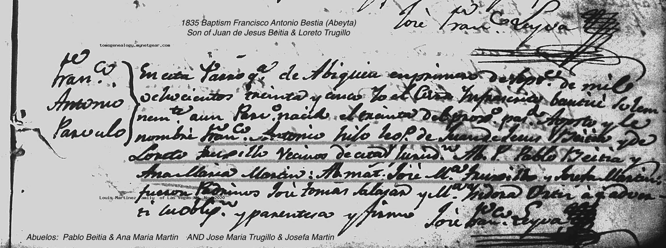 Francisco Antonio ABEYTA Baptism: August 1835 34 — Santo Tomás Apóstol, Abiquiu, Rio Arriba, New Mexico |
