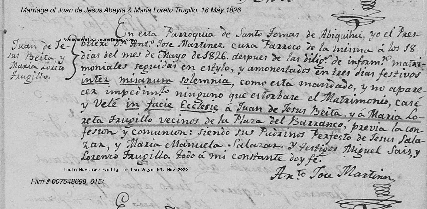 | Marriage | New Mexico Marriages record for Juan De Jesus Beita Spouse's Name Maria Loreta Trugillo Event Date 18 May 1826 Event Place Santo Tomás Apóstol, Abiquiu, Rio Arriba, New Mexico Citing this Record: Santo Tomás Apóstol, Abiquiu, Rio Arriba, New Mexico, reference ; FHL microfilm 16,621. |