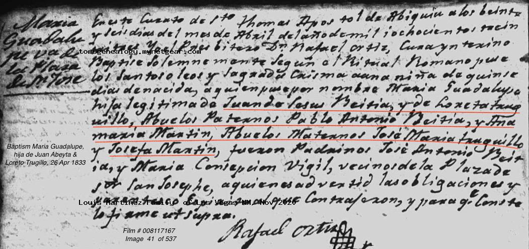 | Note | The baptism record in 1833 names the grandparents of Maria Guadalupe Abeyta; e.g the parents of Juan de Jesus Abeyta and Loreto Trugillo. Paternal Grandparents: Pablo Antonio Beitia (Abeyta) & Ana Maria Martin Maternal Grandparents: Jose Maria Trugillo & Josefa Martin Padrios: Jose Antonio Beitia & Maria Concepcion Vigil, vecinos de Plaza de Señor San Josephe. |