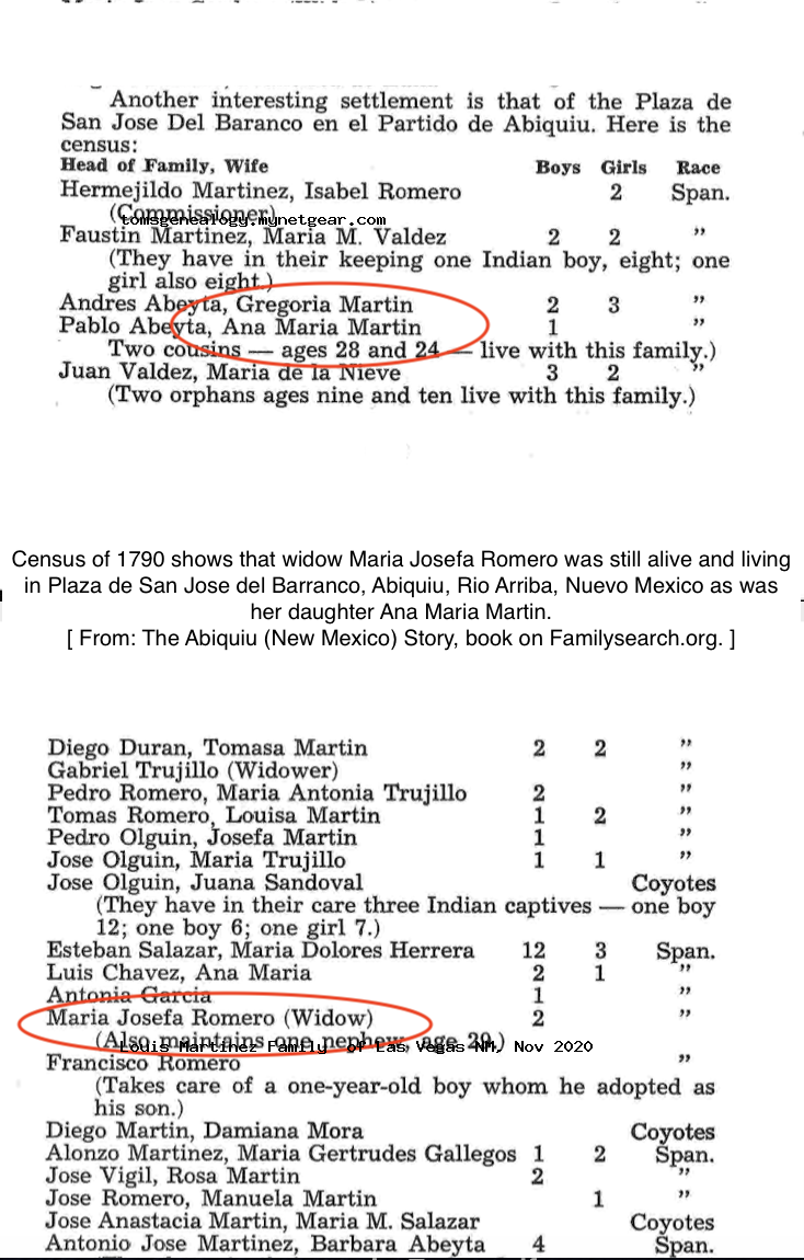 | Note | This could be relevant. Collections › Documentary Relations of the Southwest › Biofile ROMERO, JOSEFA BID Number 12581 Birth 1733: N.P. Occupation 1790: ABIQUIU (PLAZA DE BARRANCO)/(NONE) Ethnicity CRIOLLA Marriage N.D.: N.P./WIDOW Notes CENSUS IS INCOMPLETE; PICKS UP WITH NO. 198. UNCLEAR AS TO EXACT PLACE OF RESIDENCE. Source: SANM NO. 23, FR. 256 |