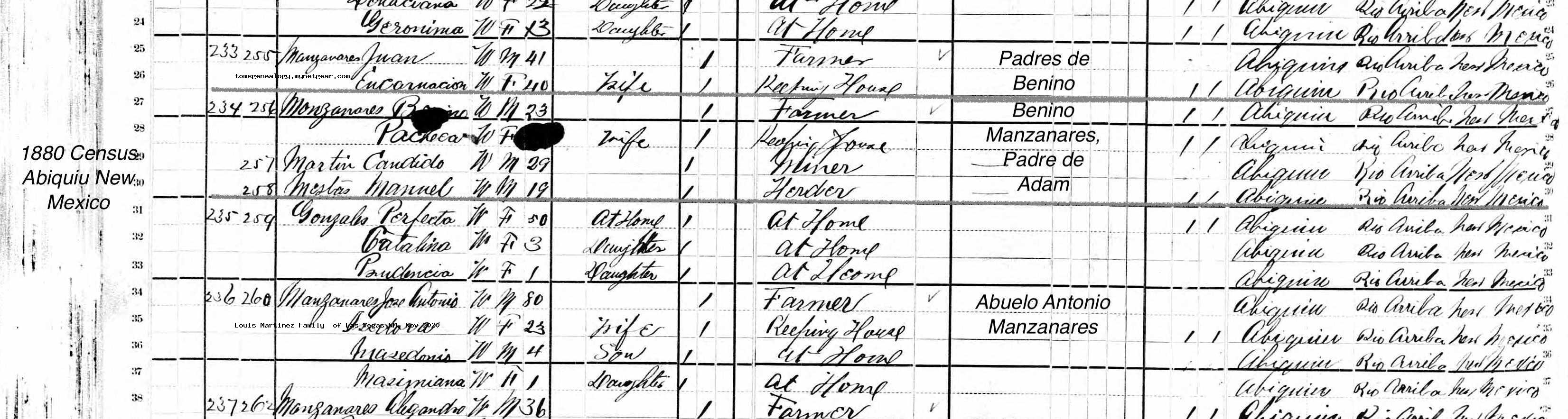 Census | 1880 (Age 45 years) 1880 Census Abiquiu NM, Manzanares Families Note: On the same page, the census lists families of Benino, his father Juan Francisco , and his grandfather Antonio (all) Manzanares. It also shows Antonio, at the age of 80, had a new wife Isidora and two small children.